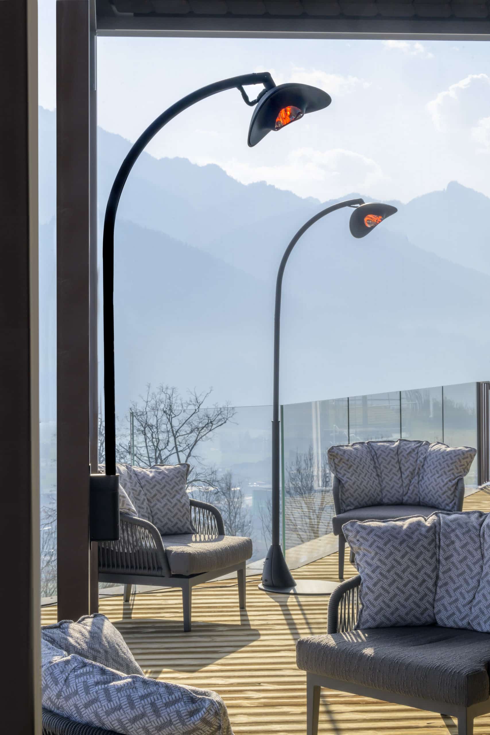 Il peut sans problème rester dehors durant l’hiver grâce à la protection IPX5 de la connectique et à la conception waterproof de la lampe chauffante.