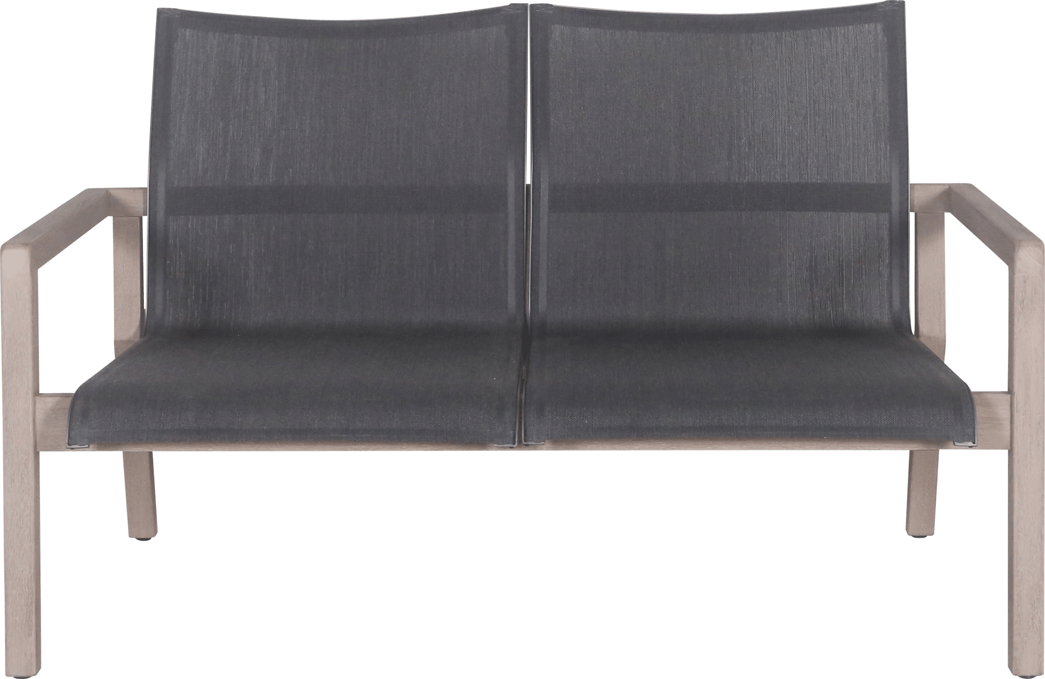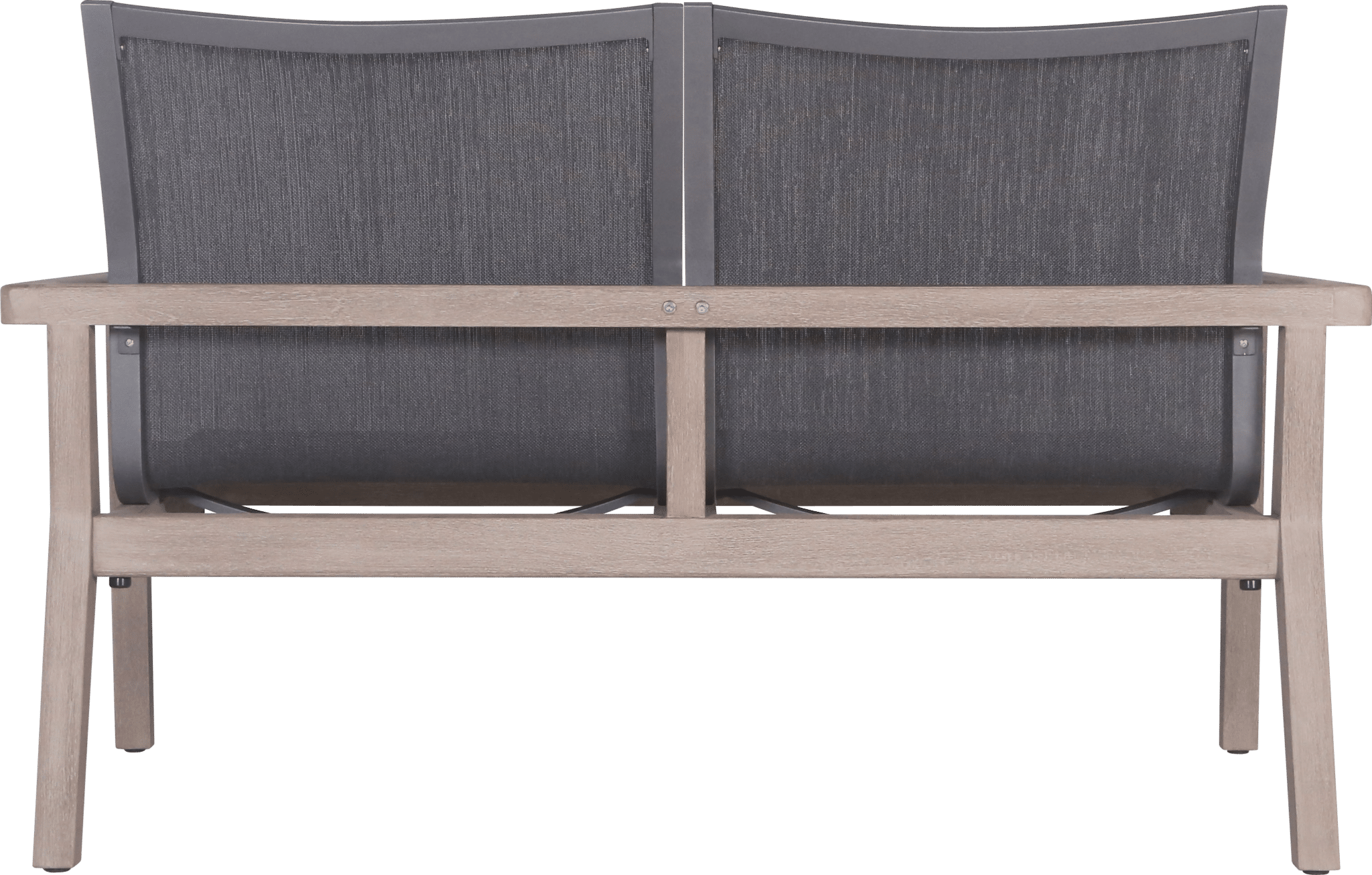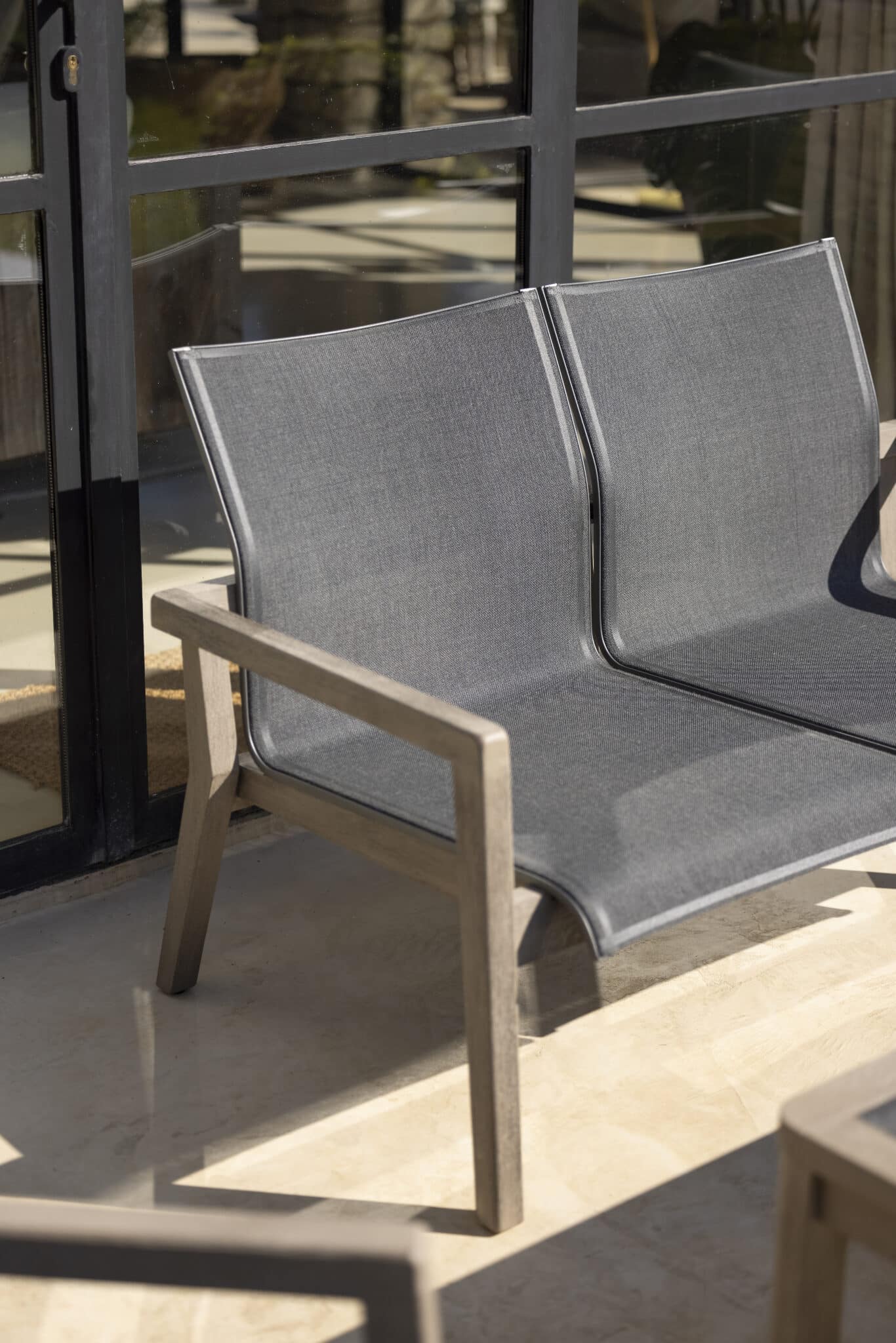 Le canapé bas empilable 2 places COPENHAGUE toile tissée graphite repose sur une structure en teck massif avec finition Duratek®, assurant stabilité et cohérence visuelle avec les autres éléments de la gamme.