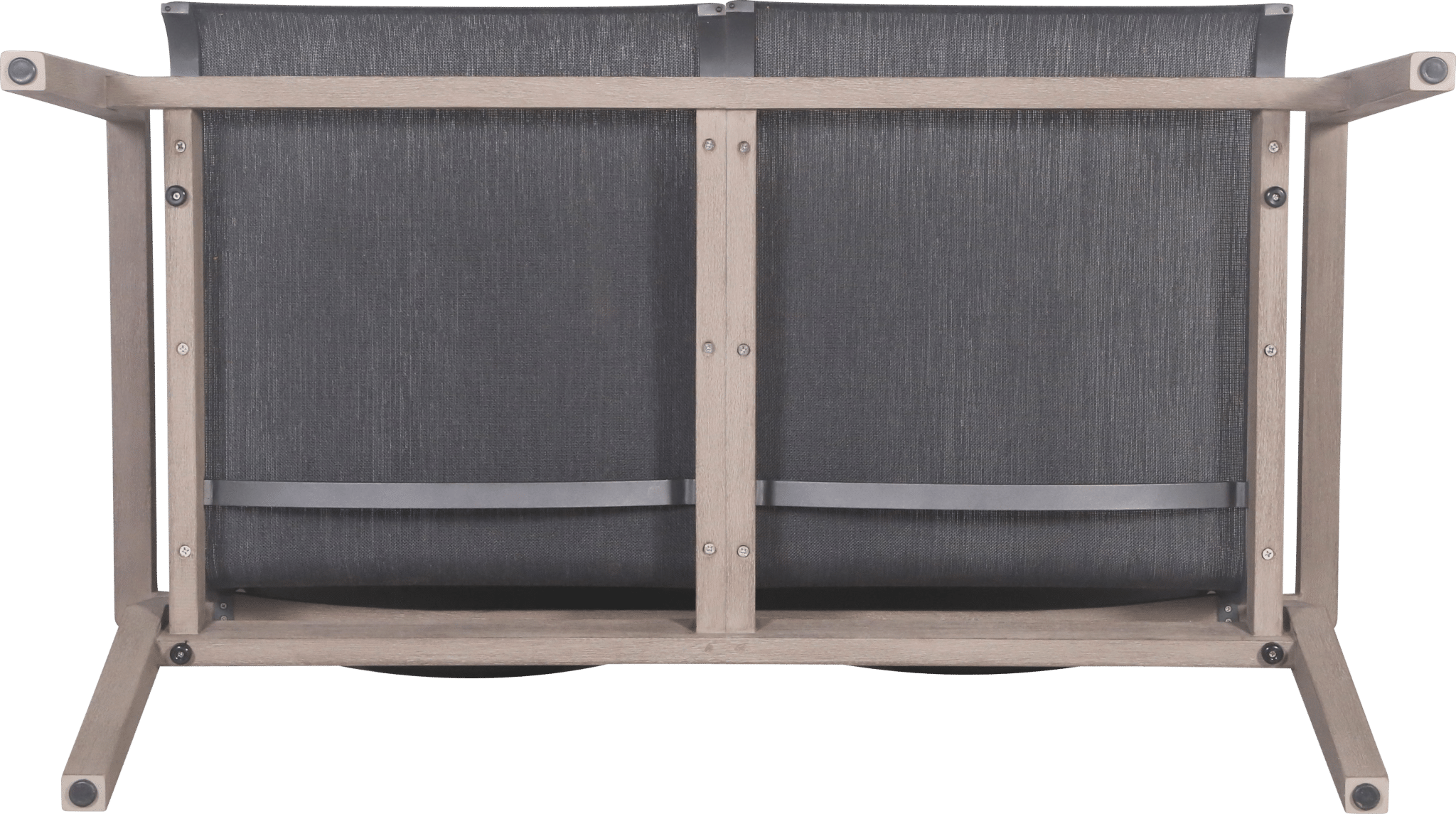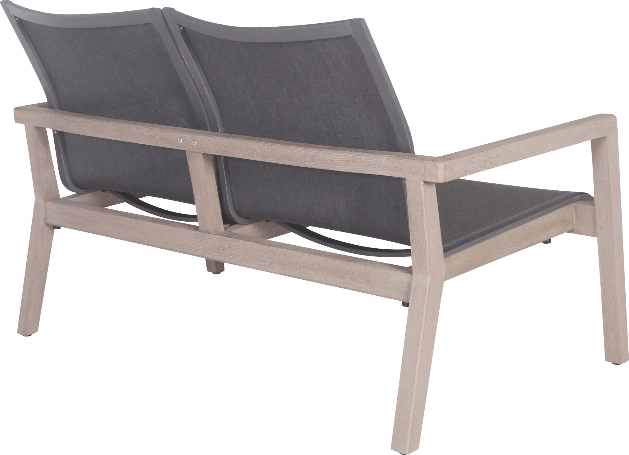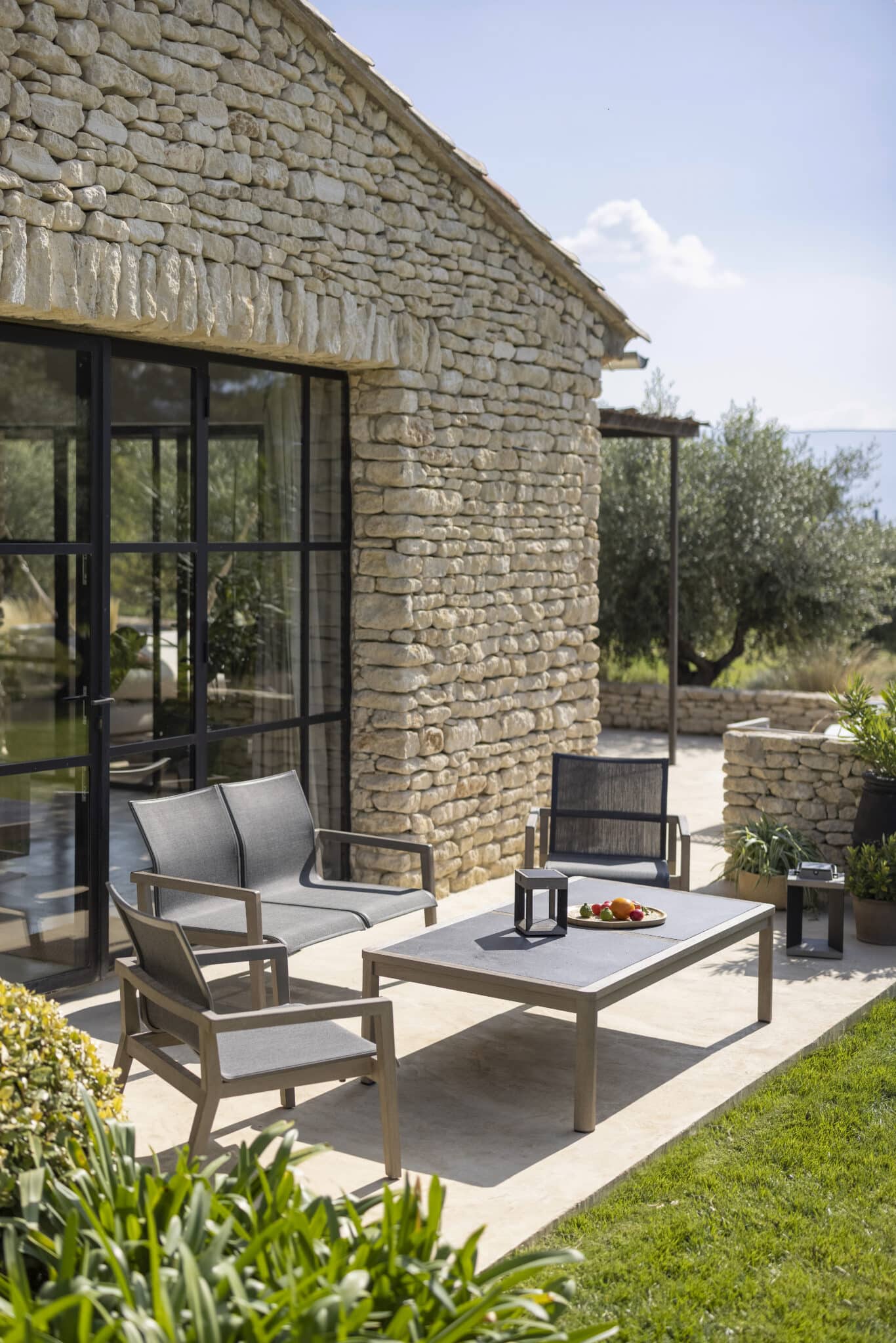 Le canapé bas empilable 2 places COPENHAGUE toile tissée graphite repose sur une structure en teck massif avec finition Duratek®, assurant stabilité et cohérence visuelle avec les autres éléments de la gamme.