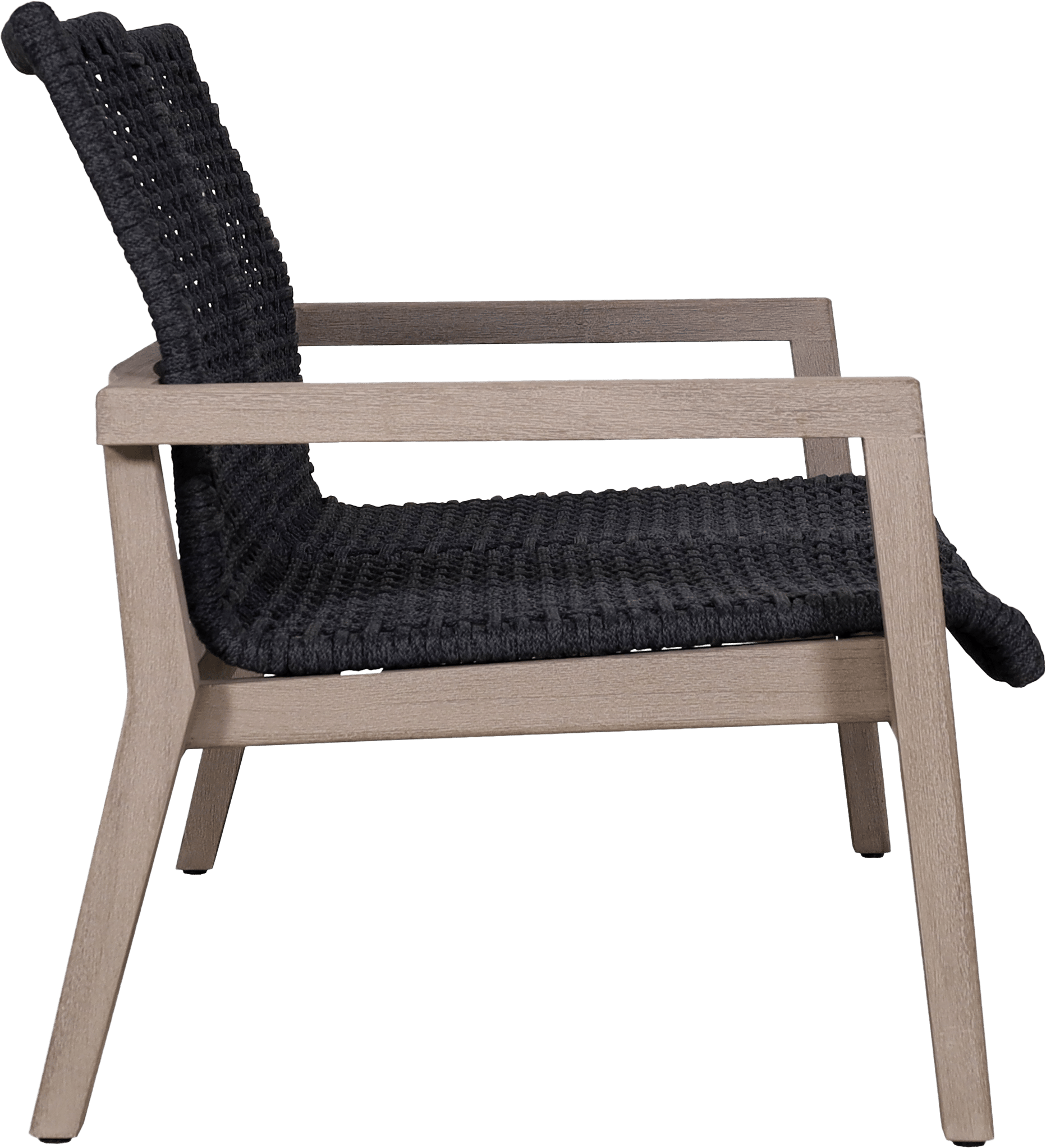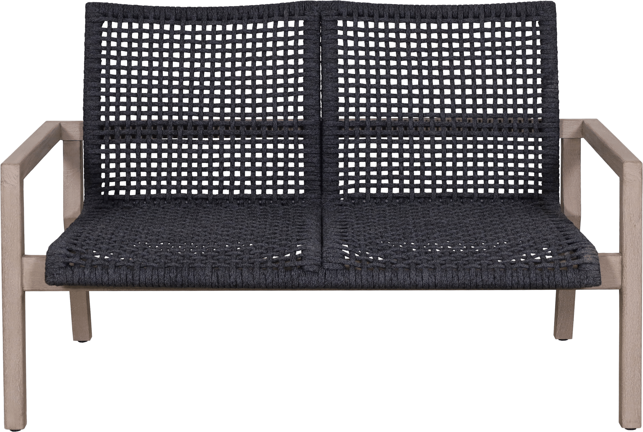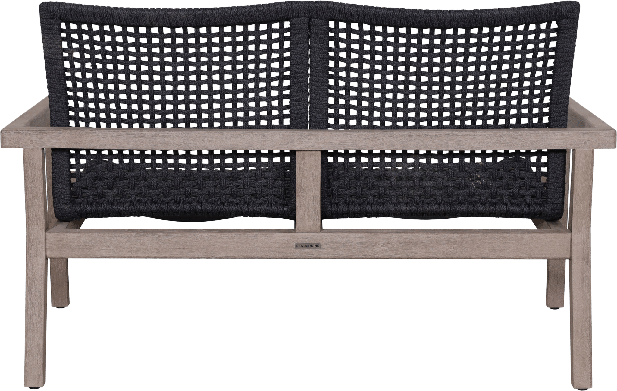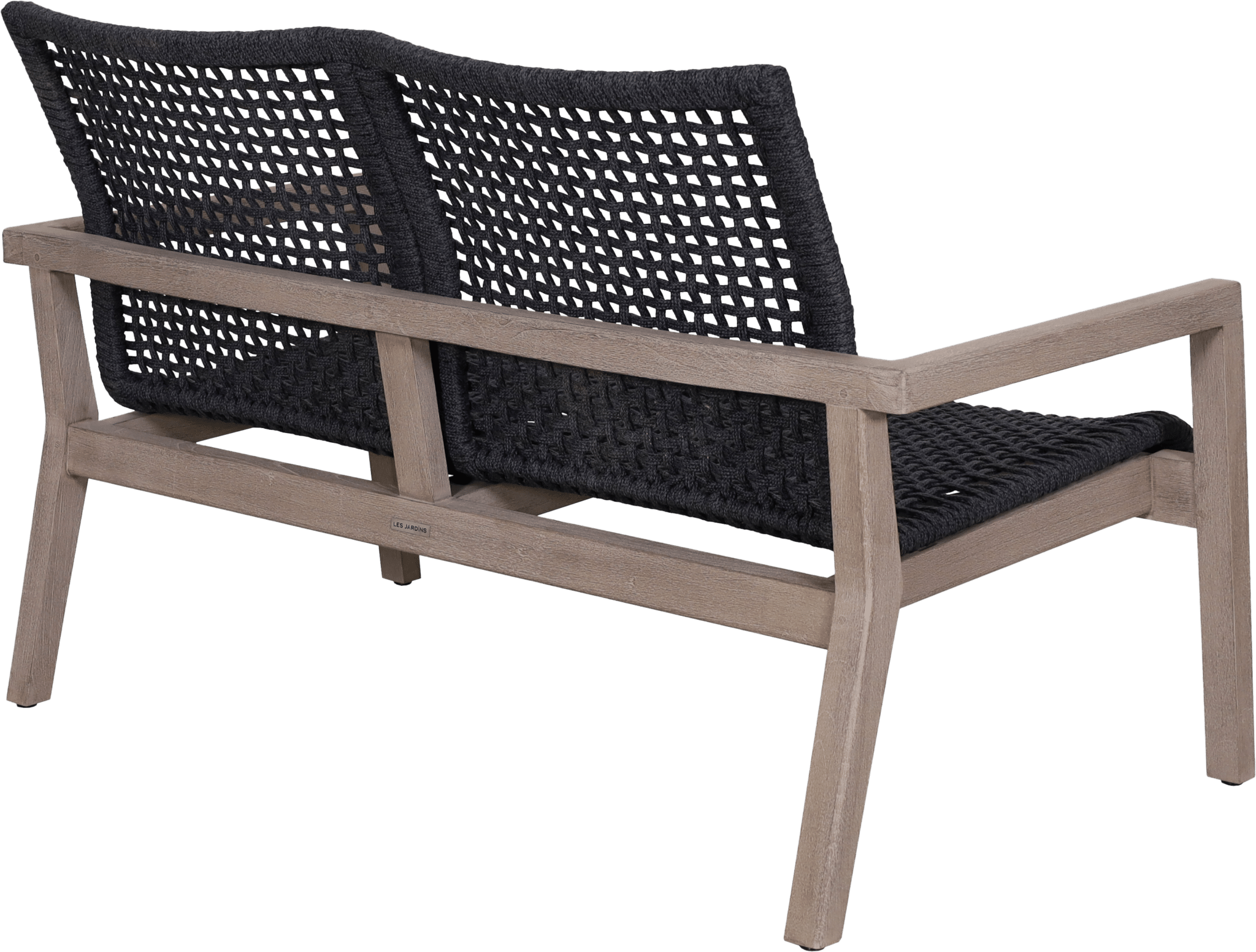 Le canapé bas empilable tressé 2 places COPENHAGUE corde plate graphite repose sur une structure en teck massif avec finition Duratek®, assurant stabilité et cohérence visuelle avec le reste de la collection.