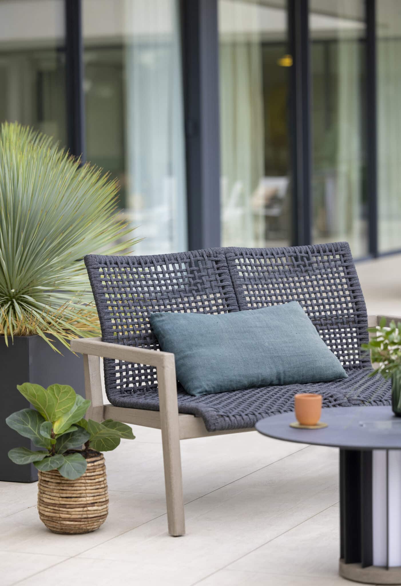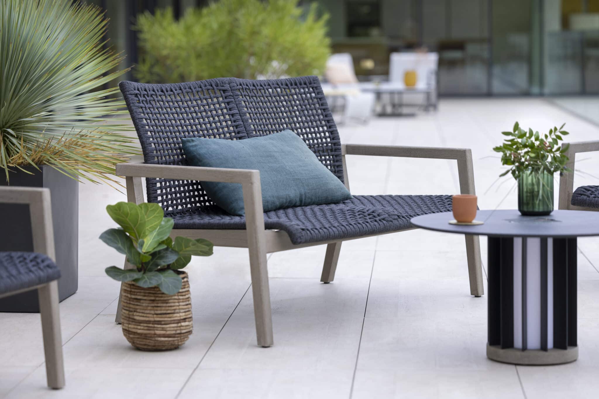 Le revêtement en corde plate graphite apporte une touche contemporaine et texturée. Son aspect tressé renforce le design du produit et s’intègre facilement dans différents styles d’aménagement extérieur.