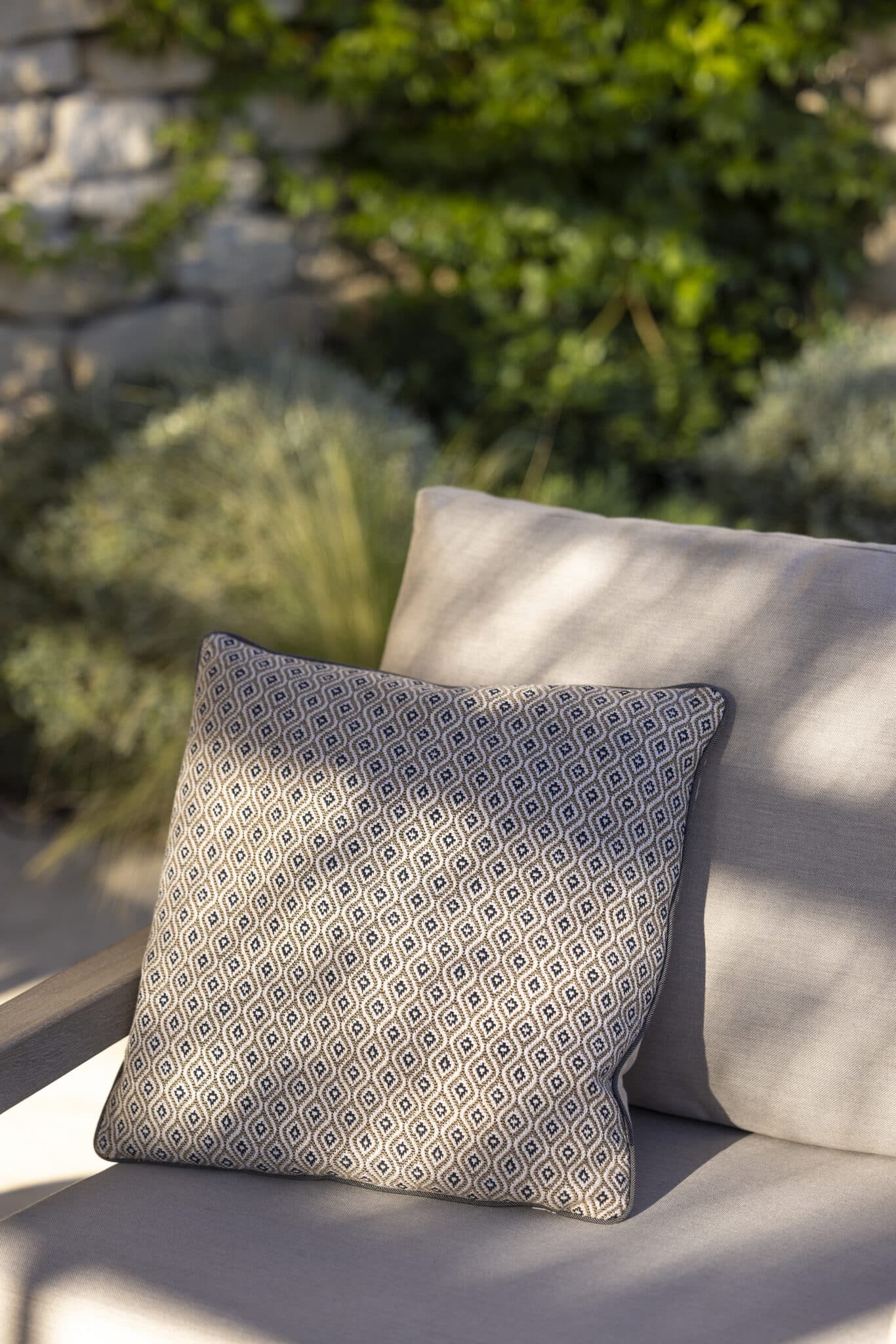 L’assise en Agora Panama fossil apporte une finition textile élégante et s’intègre facilement dans différents styles d’aménagement extérieur.
