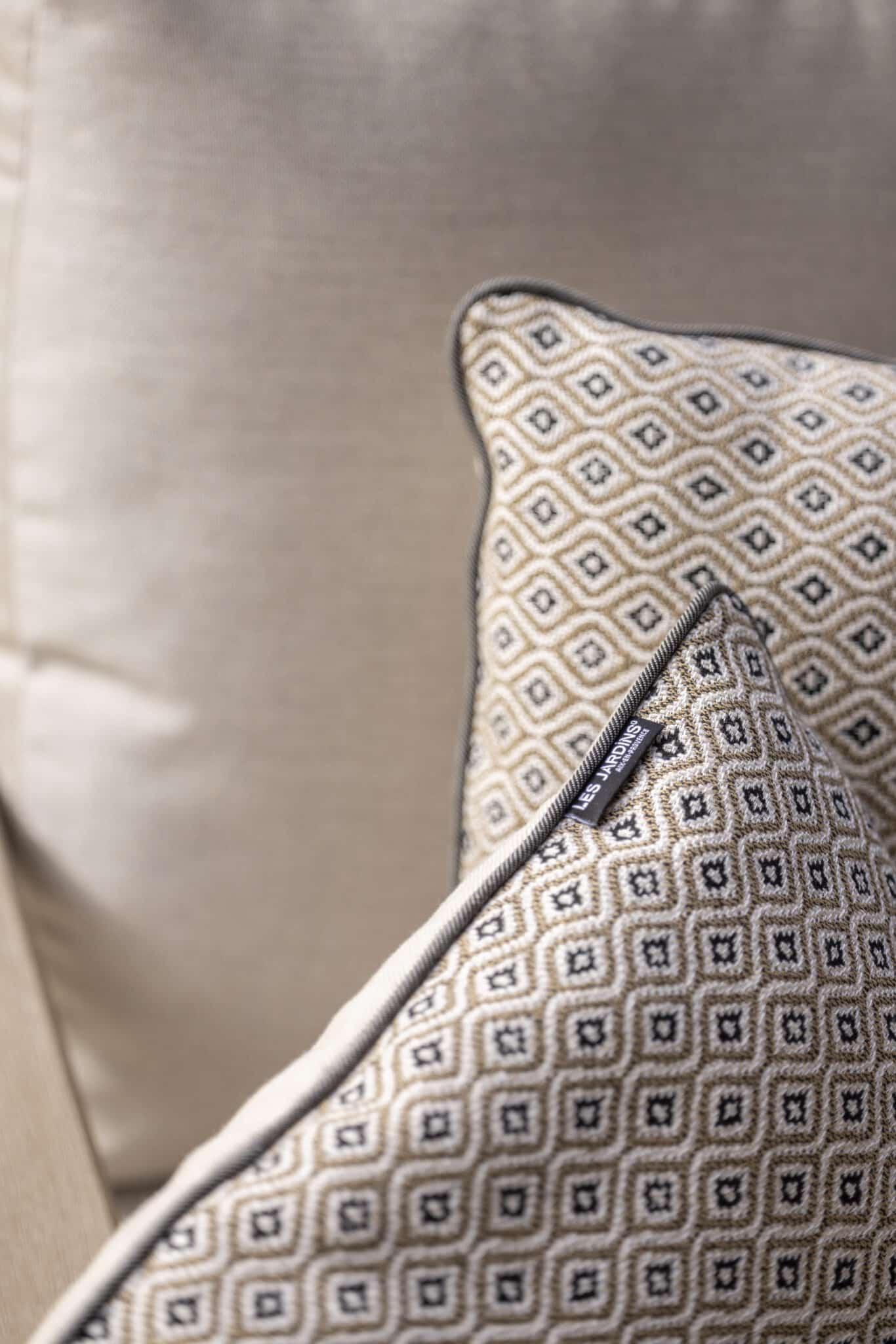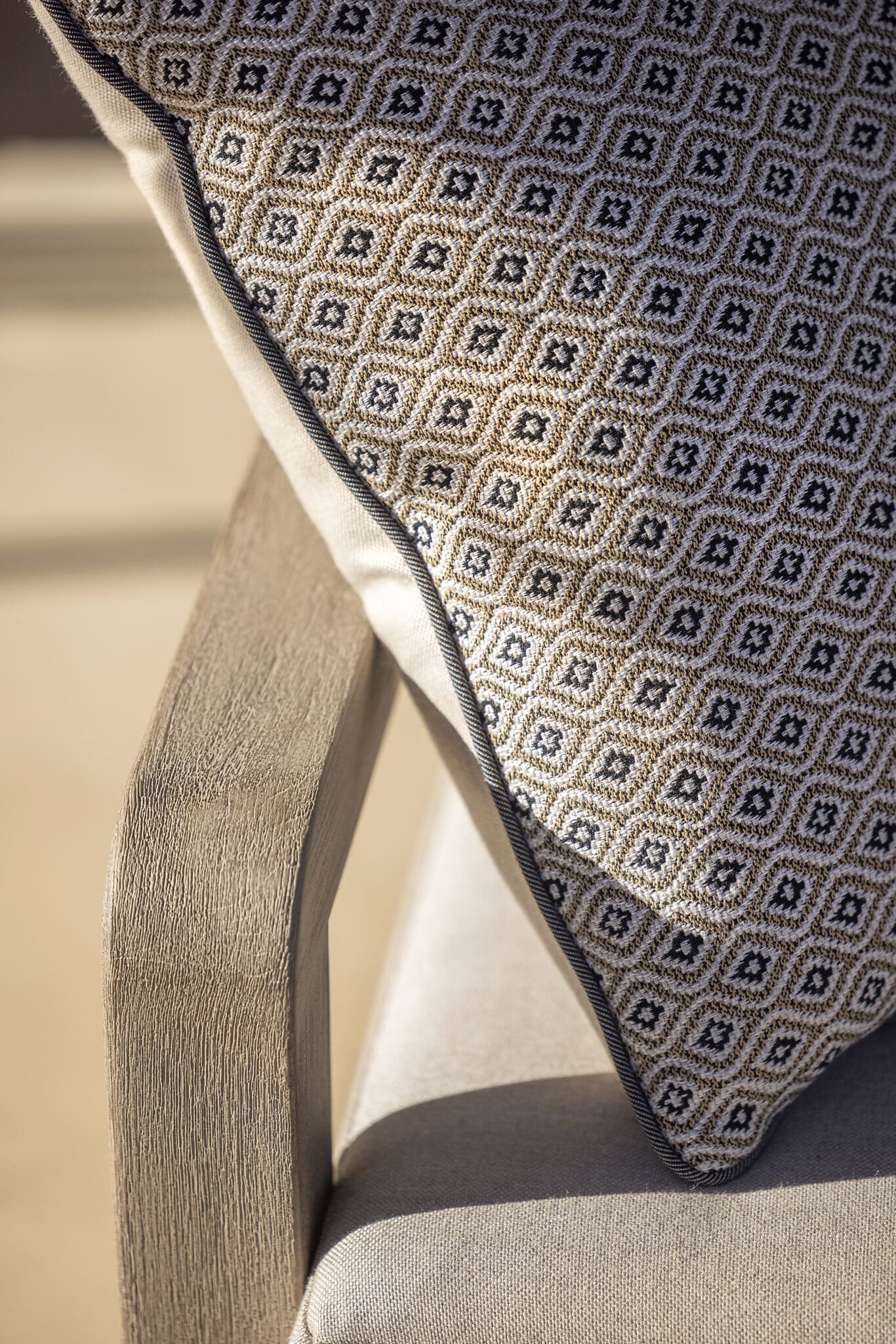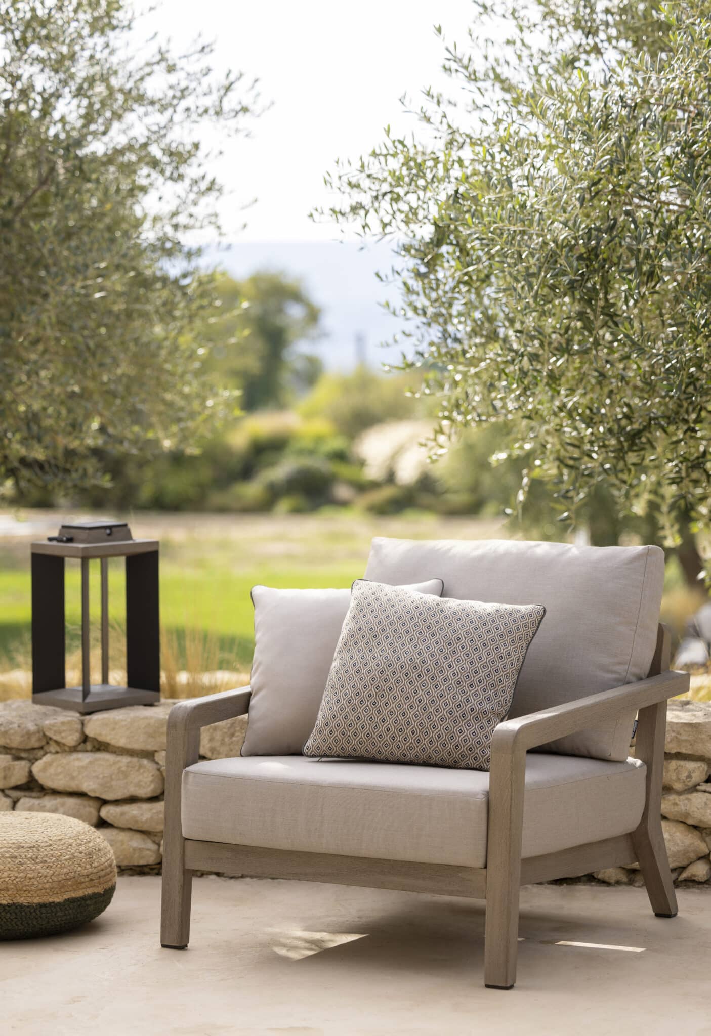 Le fauteuil COPENHAGUE Agora Panama fossil est complété par un coussin déco rafia, renforçant l’esthétique et le confort du produit.