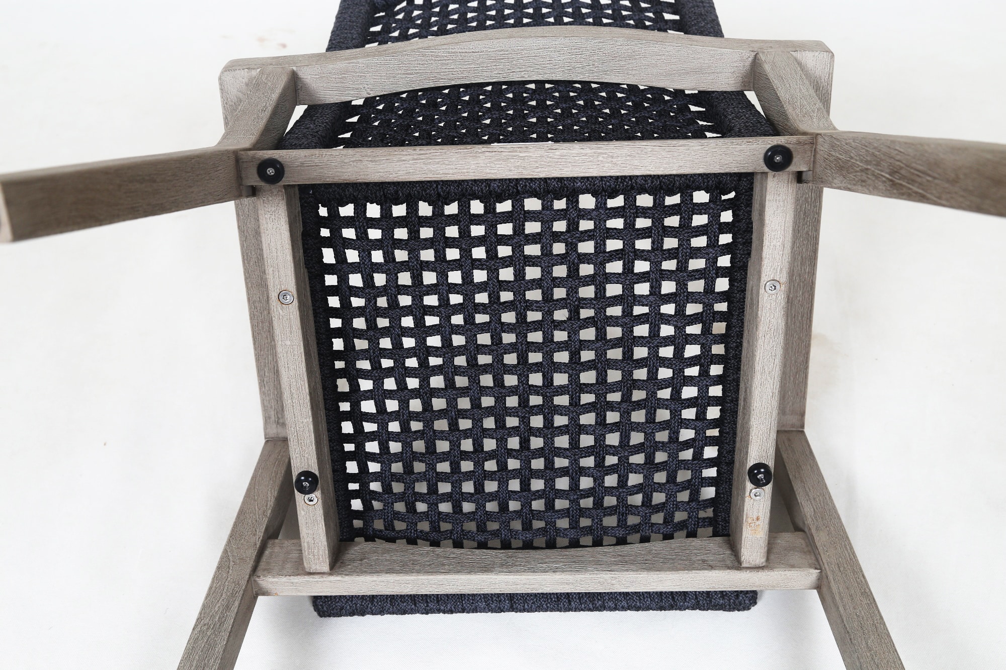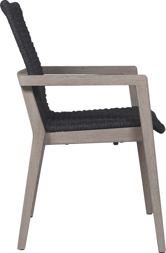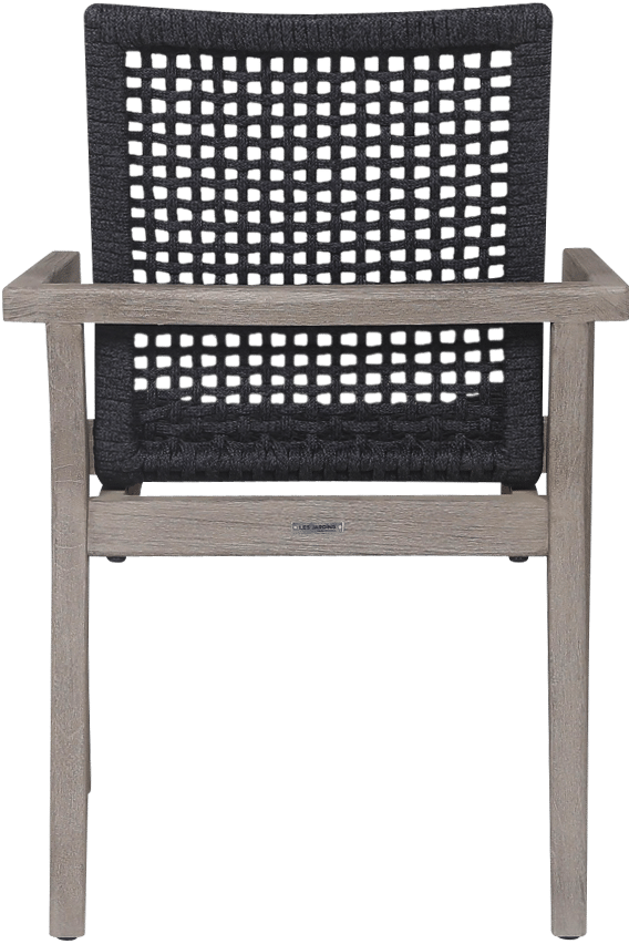 Le fauteuil empilable tressé COPENHAGUE corde plate graphite repose sur une structure en teck massif avec finition Duratek®, assurant stabilité et cohérence avec le reste de la collection.