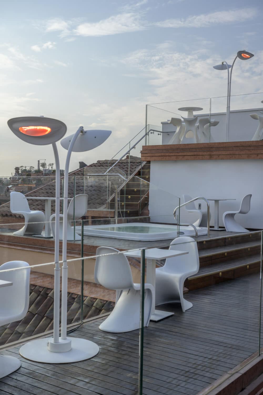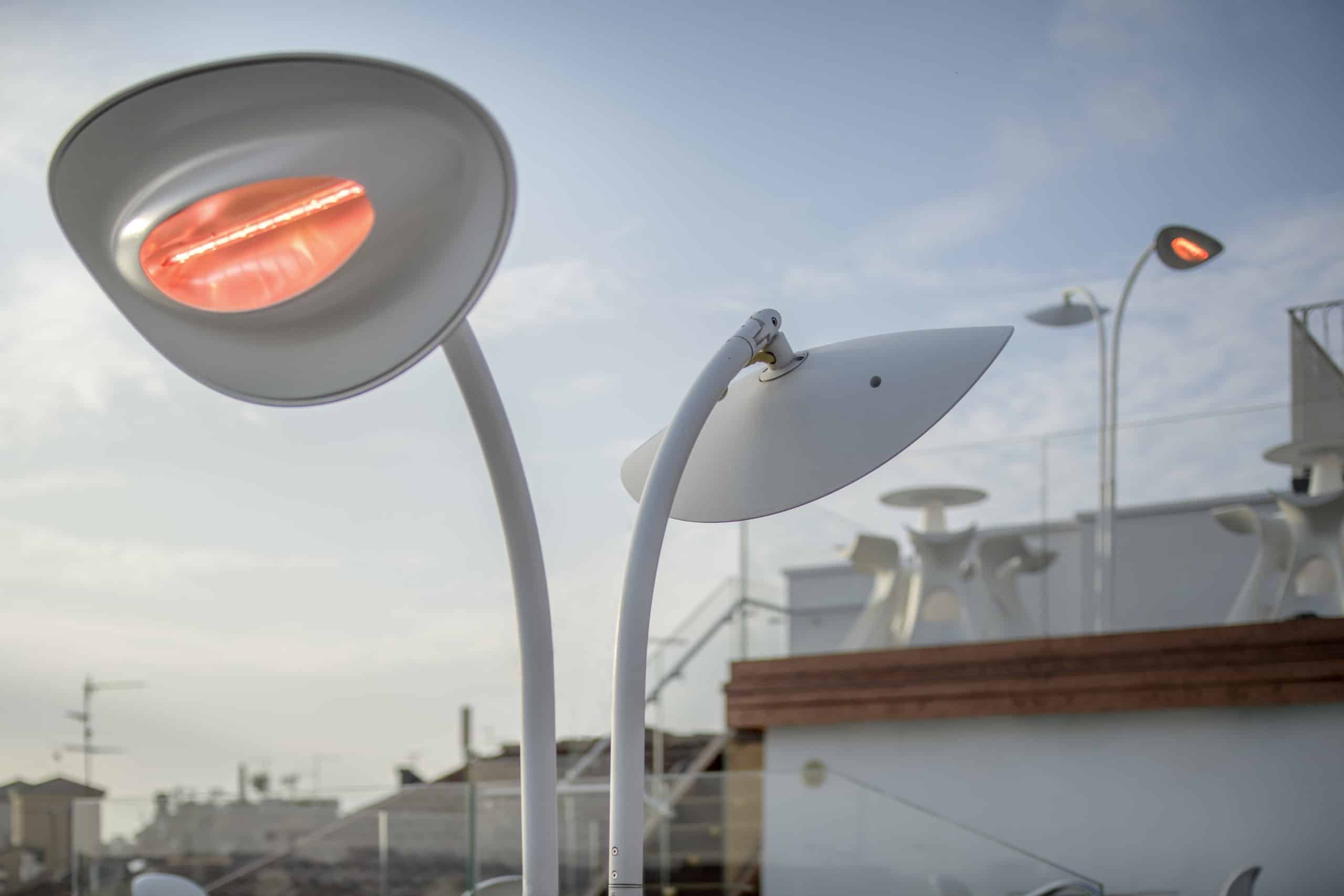Le lampadaire double chauffant de Phormalab peut être installé à l’intérieur mais avant tout à l’extérieur.