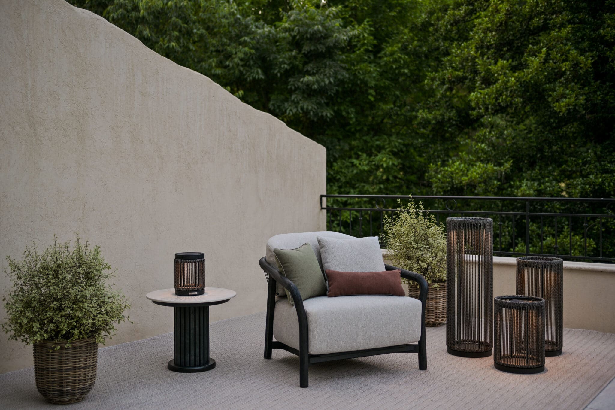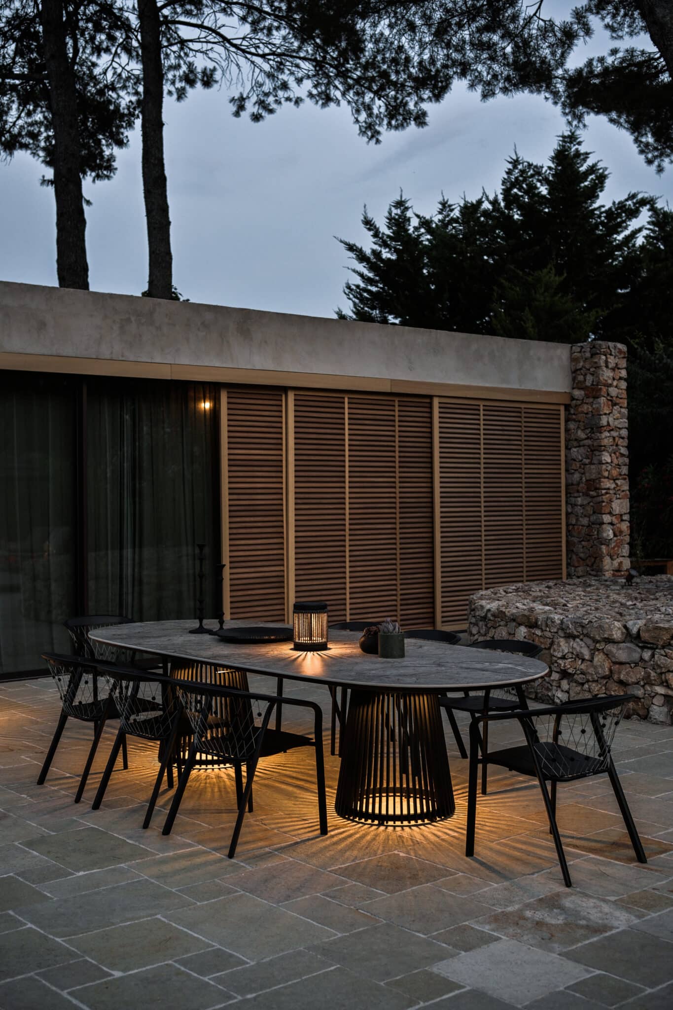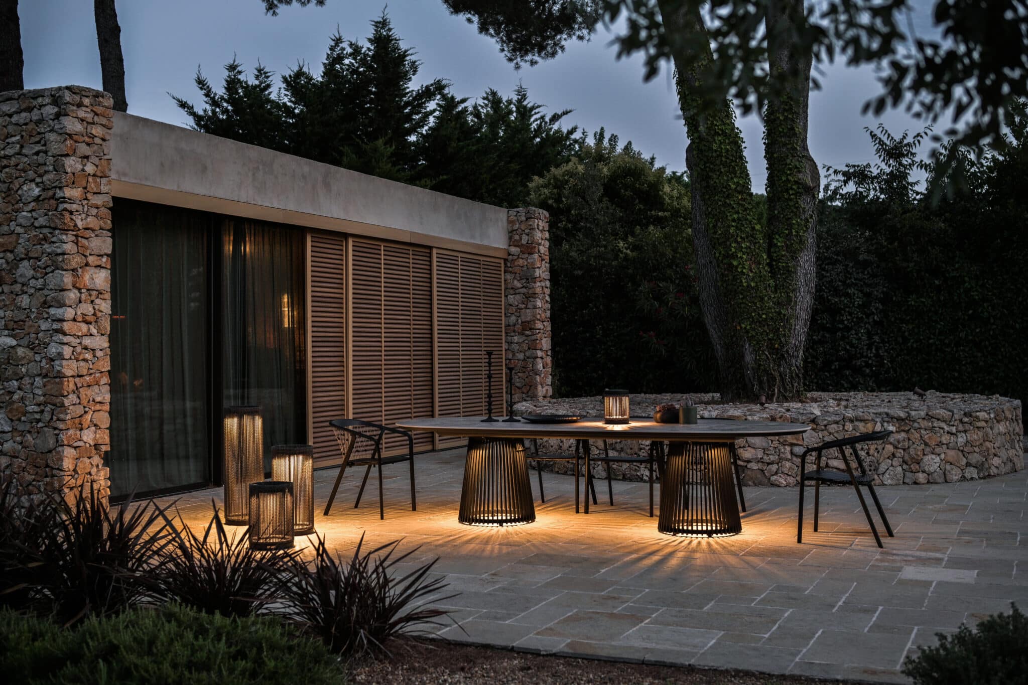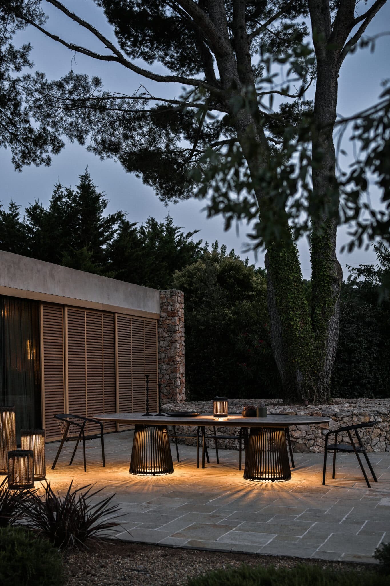 Elle structure visuellement un espace extérieur tout en apportant une lumière élégante et contemporaine.