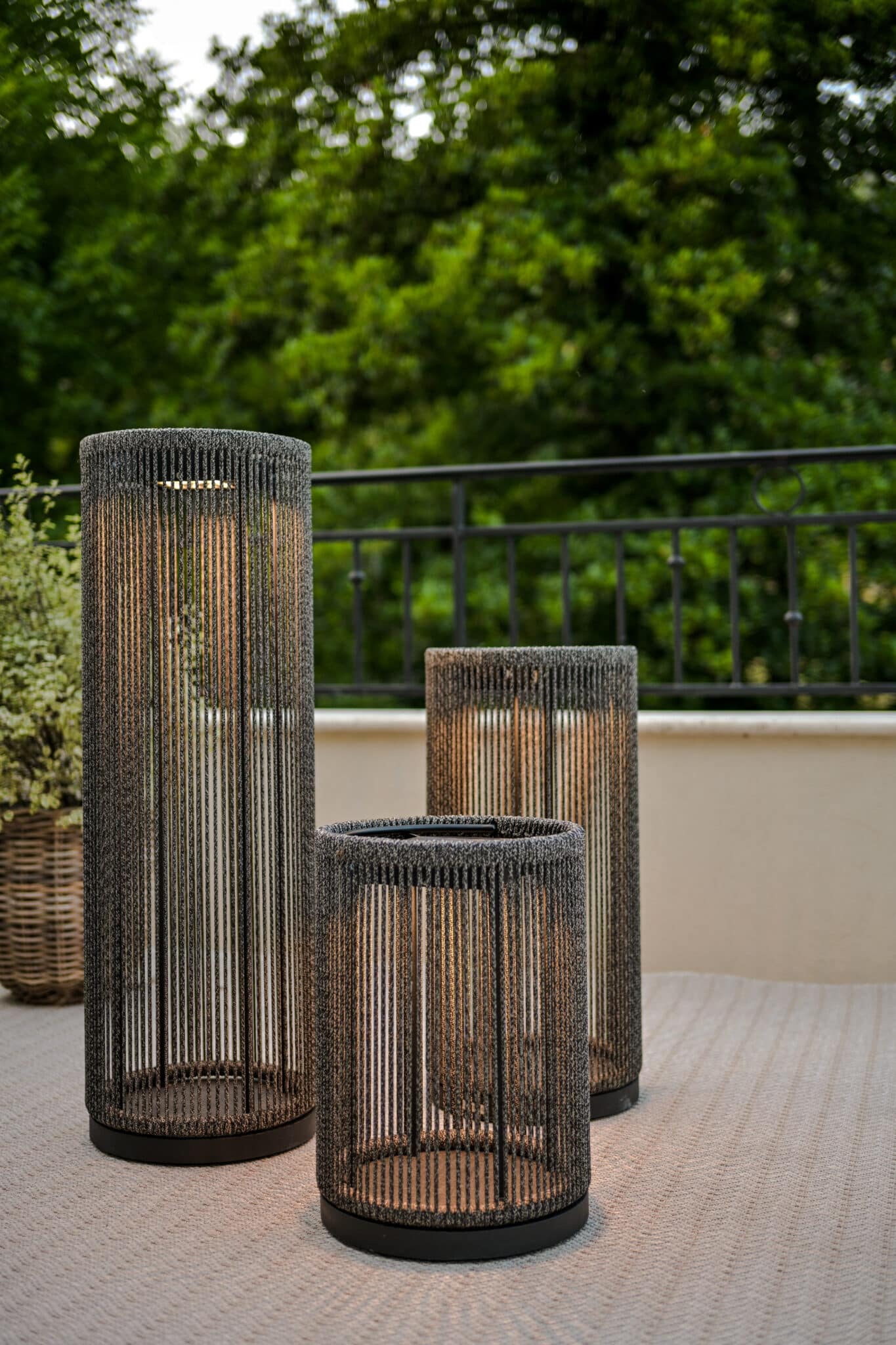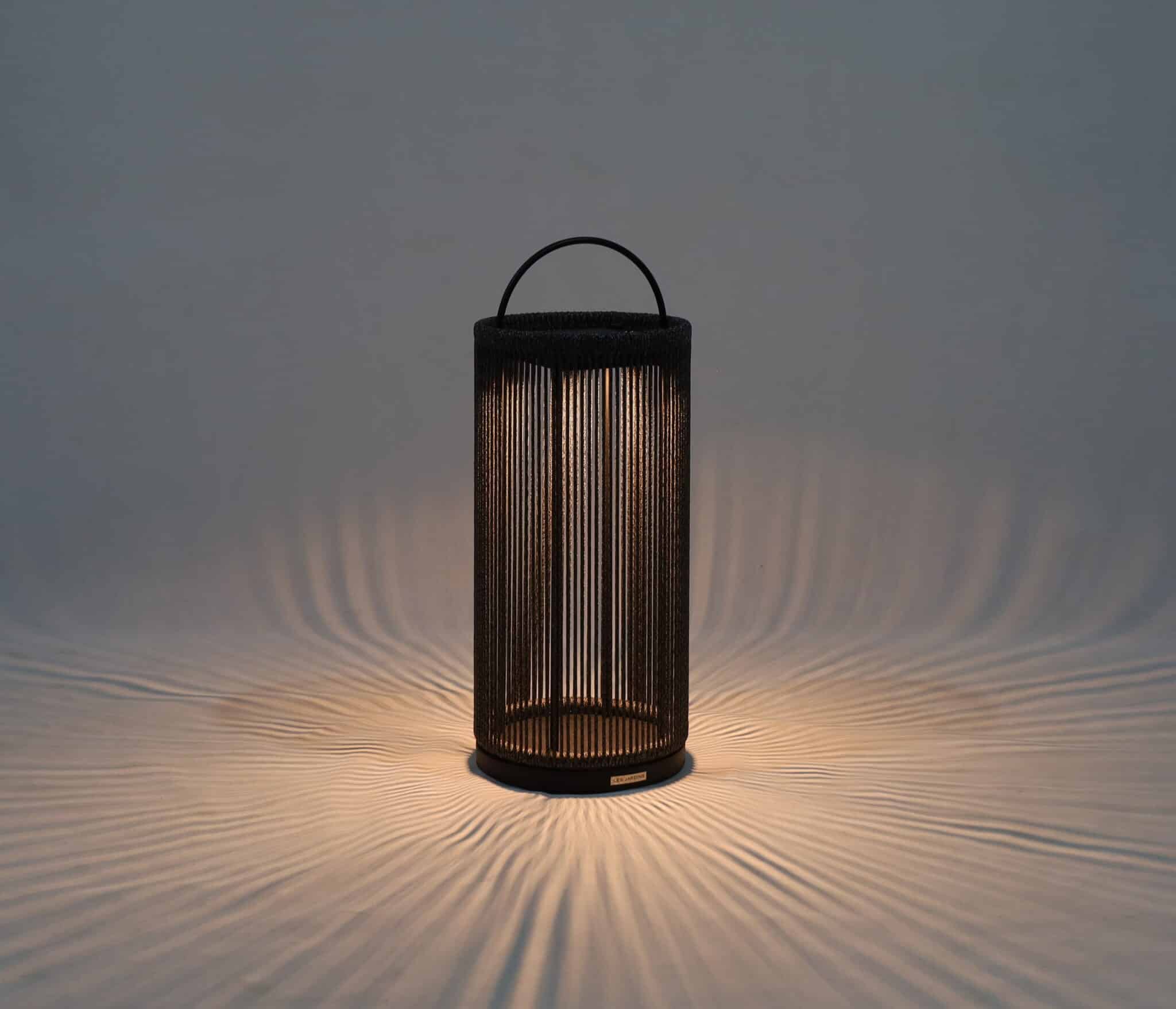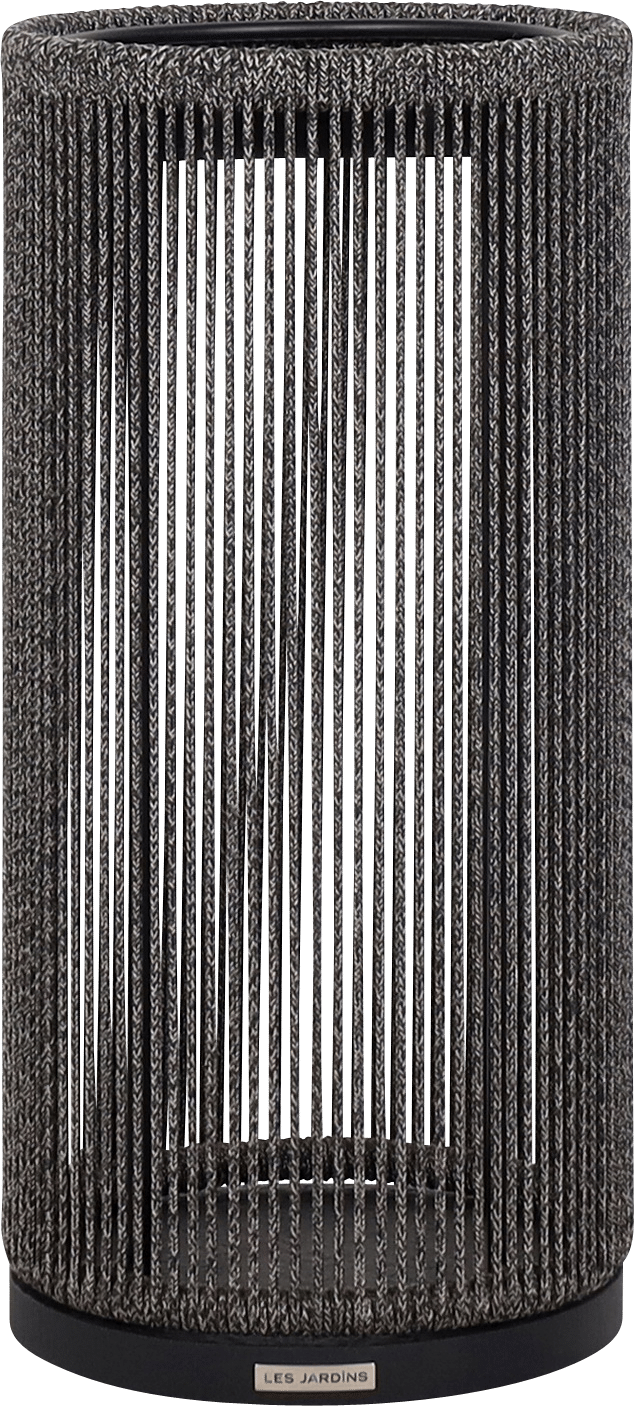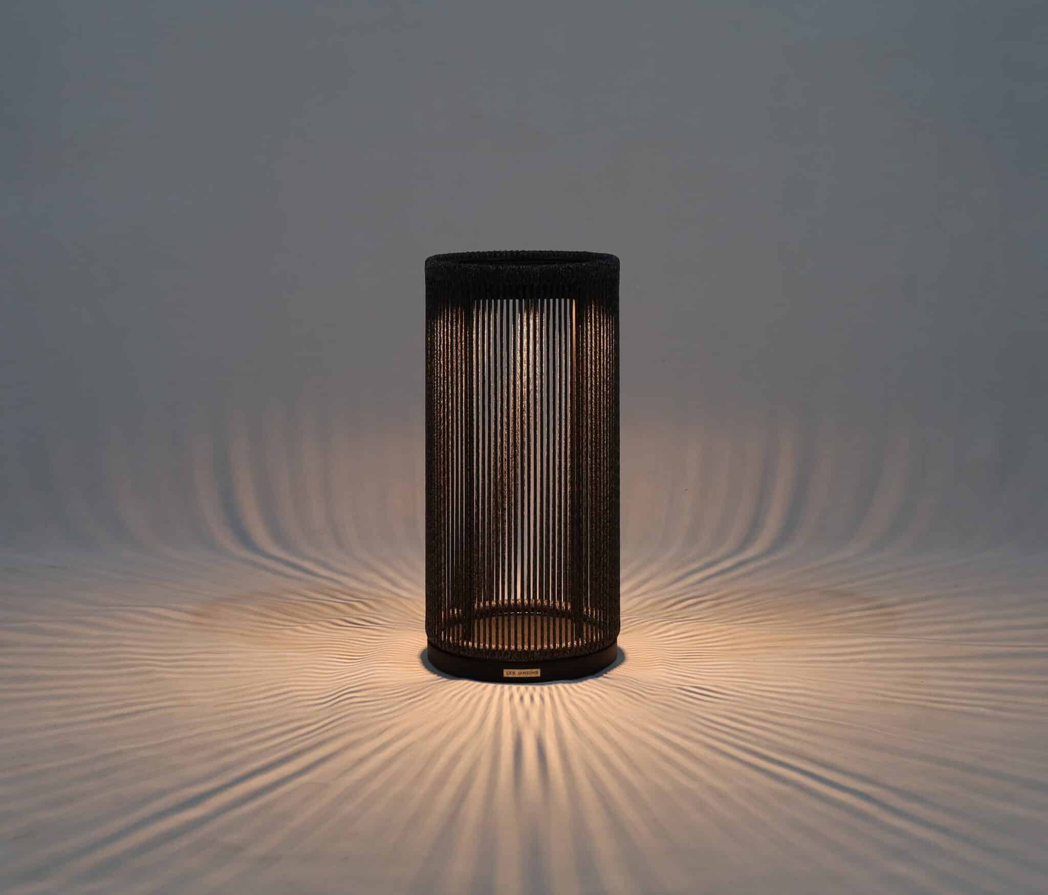 Fabriquée en granite noir avec une corde ronde noire chinée, cette lampe apporte une signature décorative forte.
