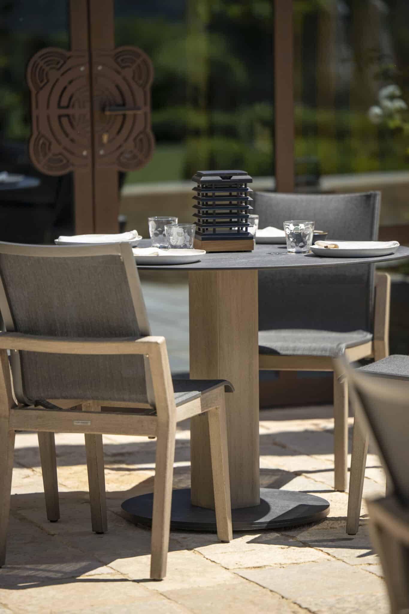 Son design structuré en teck massif et HPL ardoise apporte une touche naturelle et contemporaine à vos extérieurs.