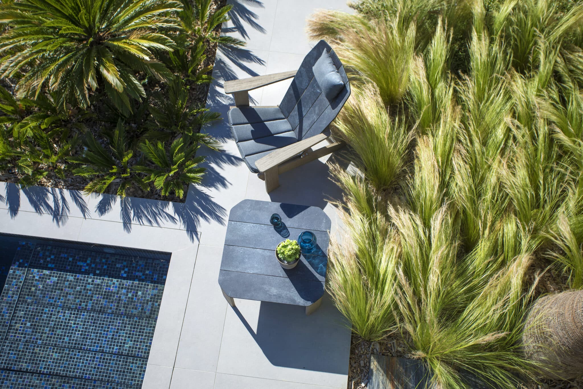 Le plateau en HPL ardoise apporte une finition minérale et contemporaine, s’intégrant facilement dans différents styles d’aménagement extérieur.