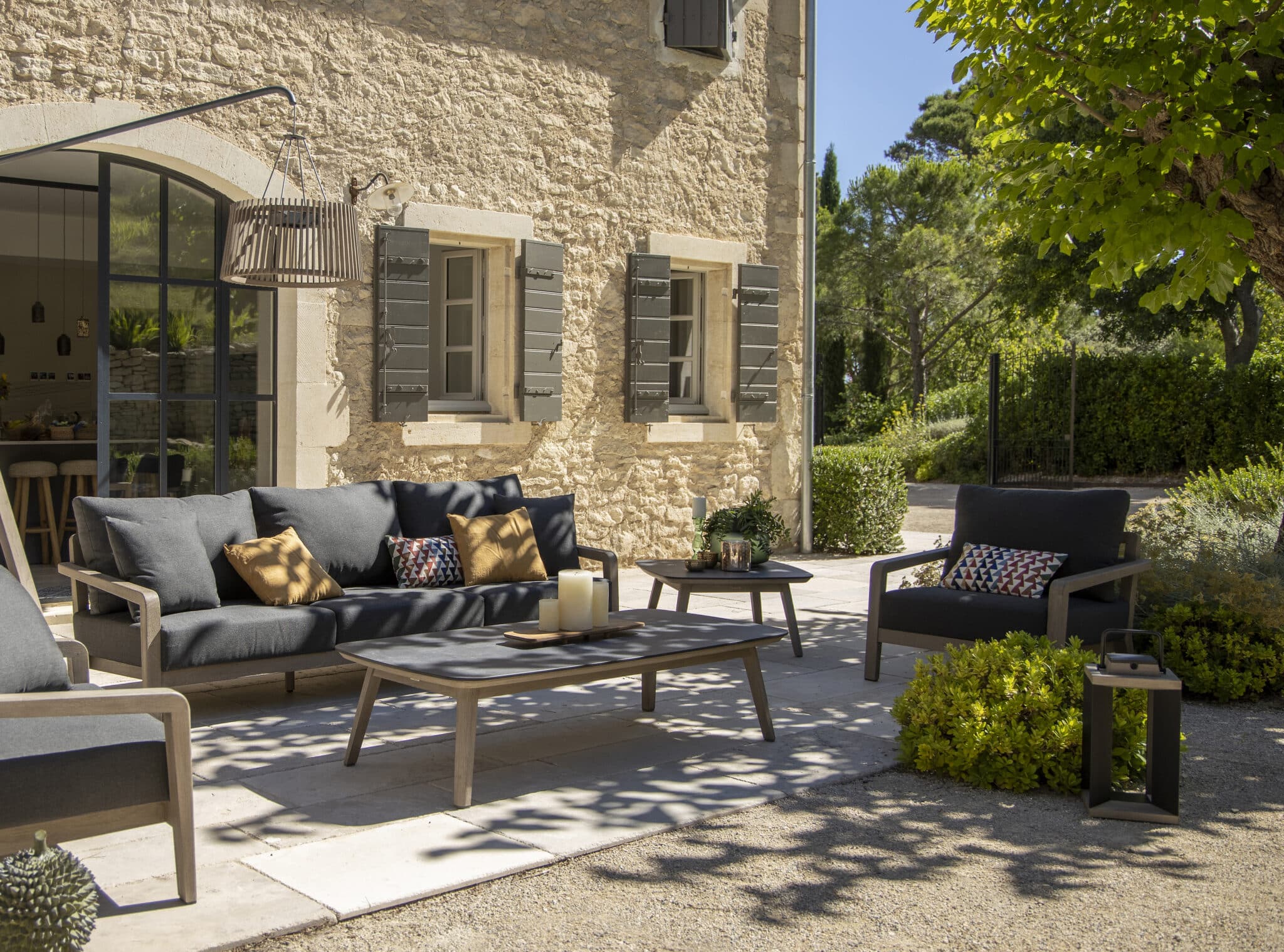 La table basse COPENHAGUE XL HPL ardoise associe une structure en teck massif avec finition Duratek® à un plateau en HPL finition ardoise. Cette combinaison apporte un rendu moderne et naturel, parfaitement adapté à un environnement extérieur.