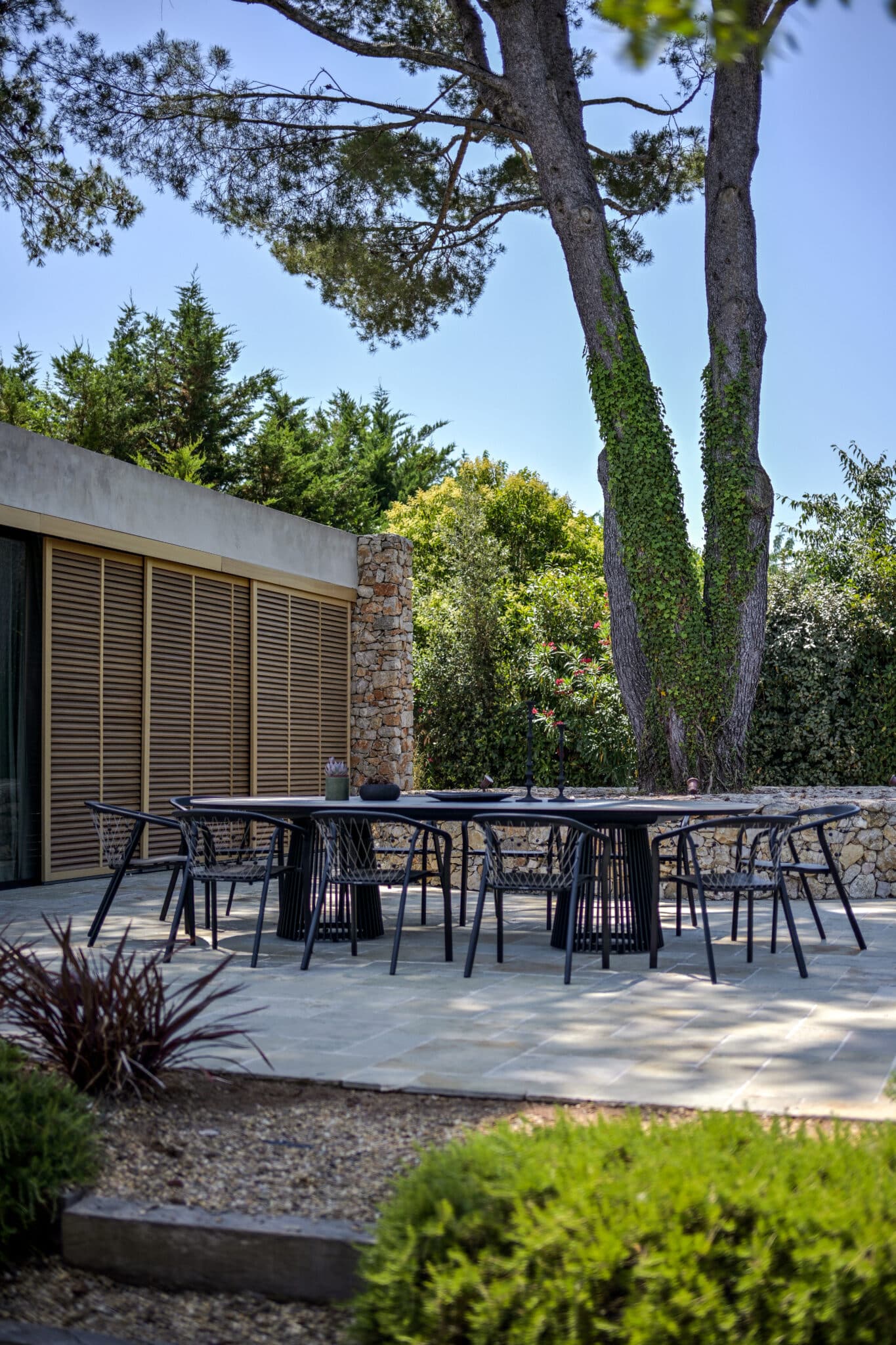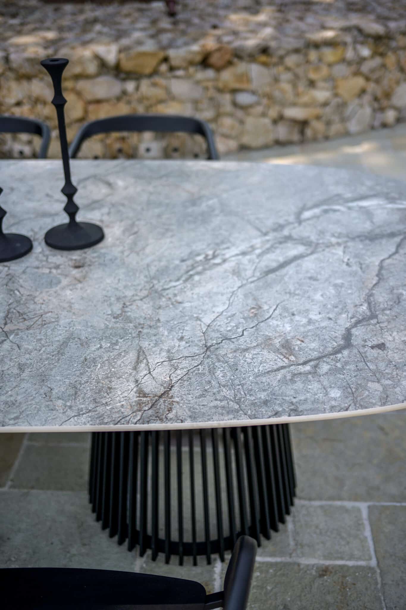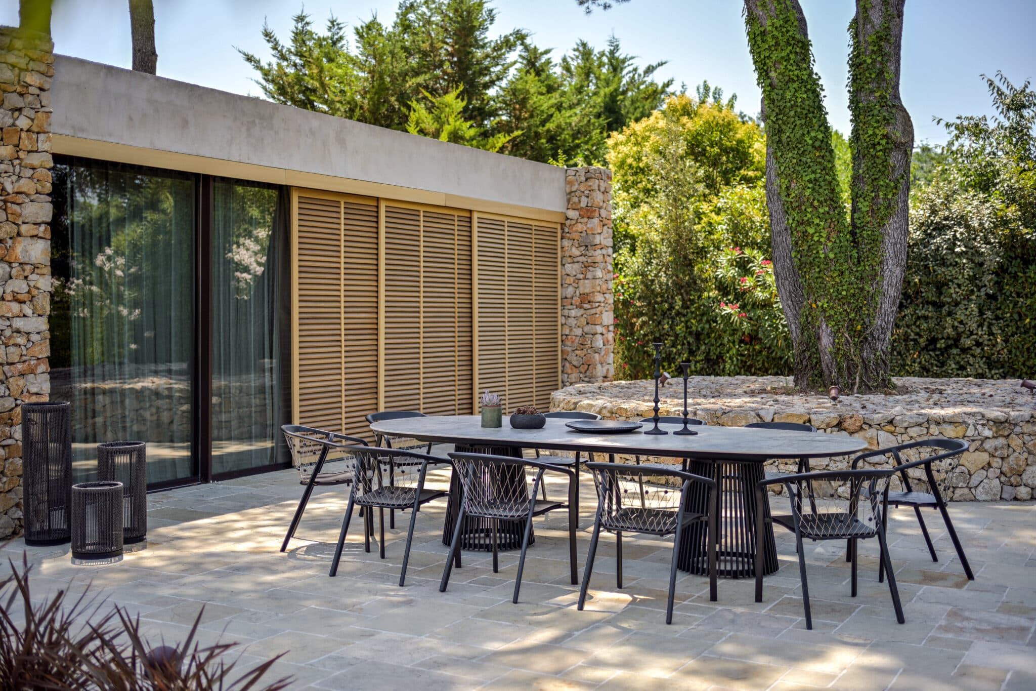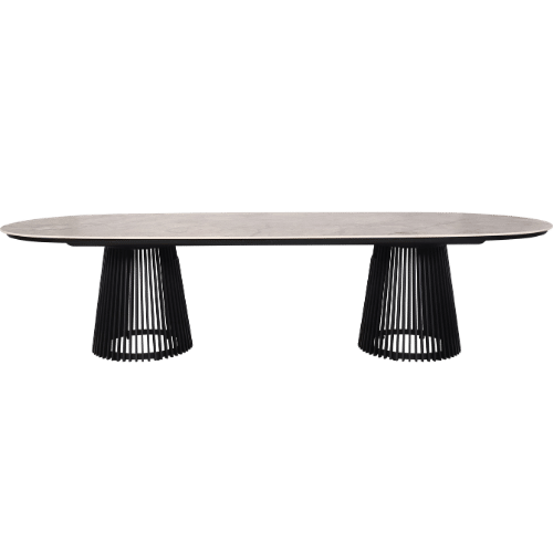 La Table de repas HALO 12/14 places se distingue par son design ovale et son piètement travaillé. Son aluminium noir lui donne une allure contemporaine, tandis que son plateau en céramique Salika renforce son style minéral et premium. Elle s’intègre parfaitement dans les aménagements extérieurs modernes.