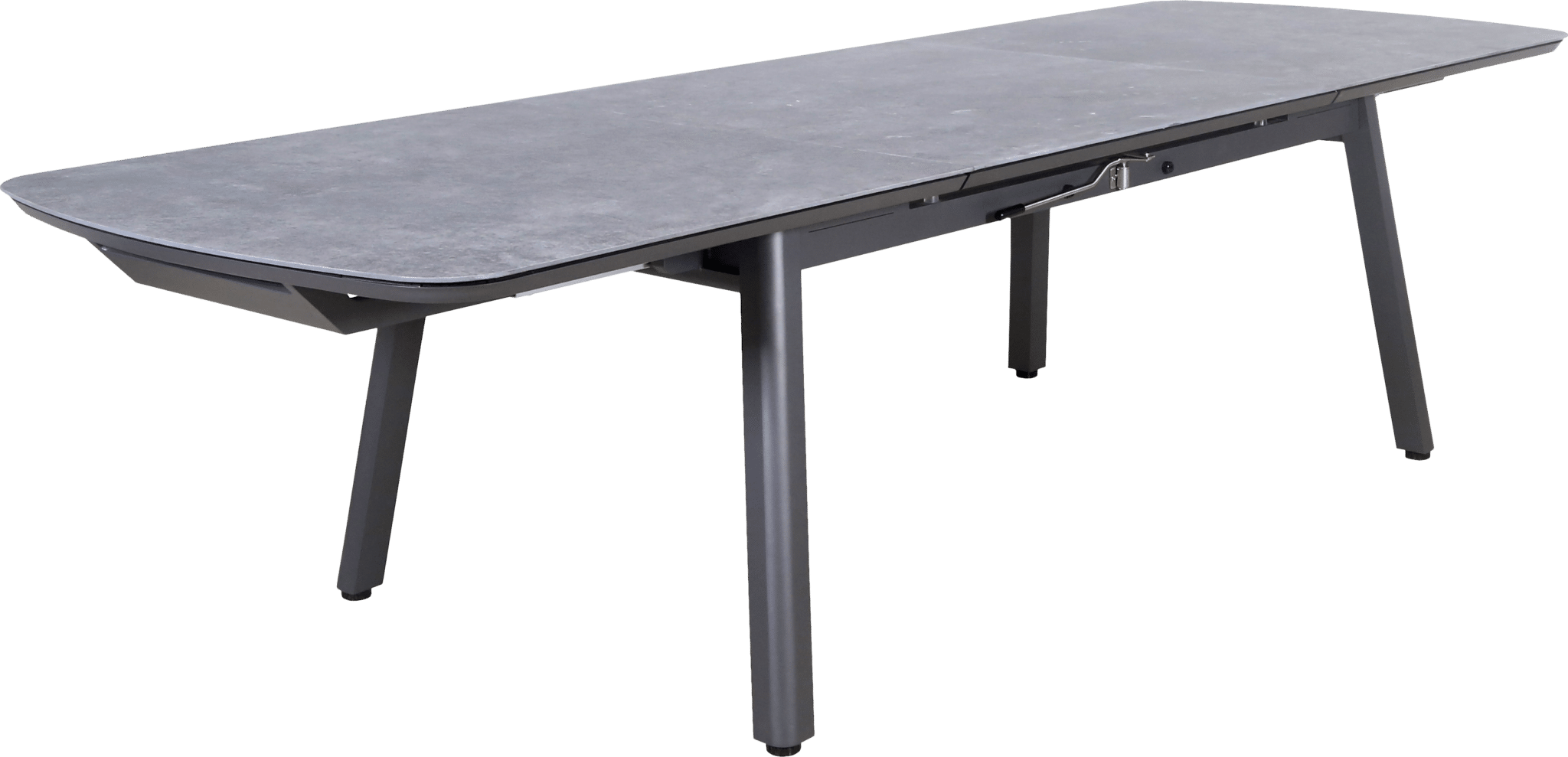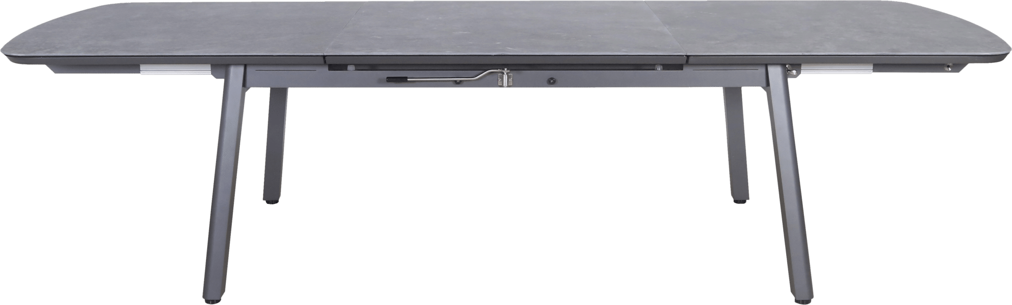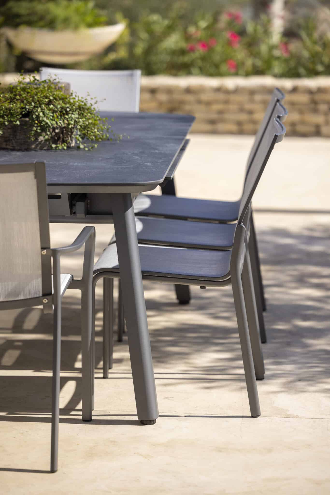 table extensible COPENHAGUE aluminium gris espace HPL ardoise conçue pour aménager un espace extérieur modulable, avec une grande capacité d’accueil et un design contemporain. Son système d’allonge permet d’adapter facilement la table selon le nombre de convives.
