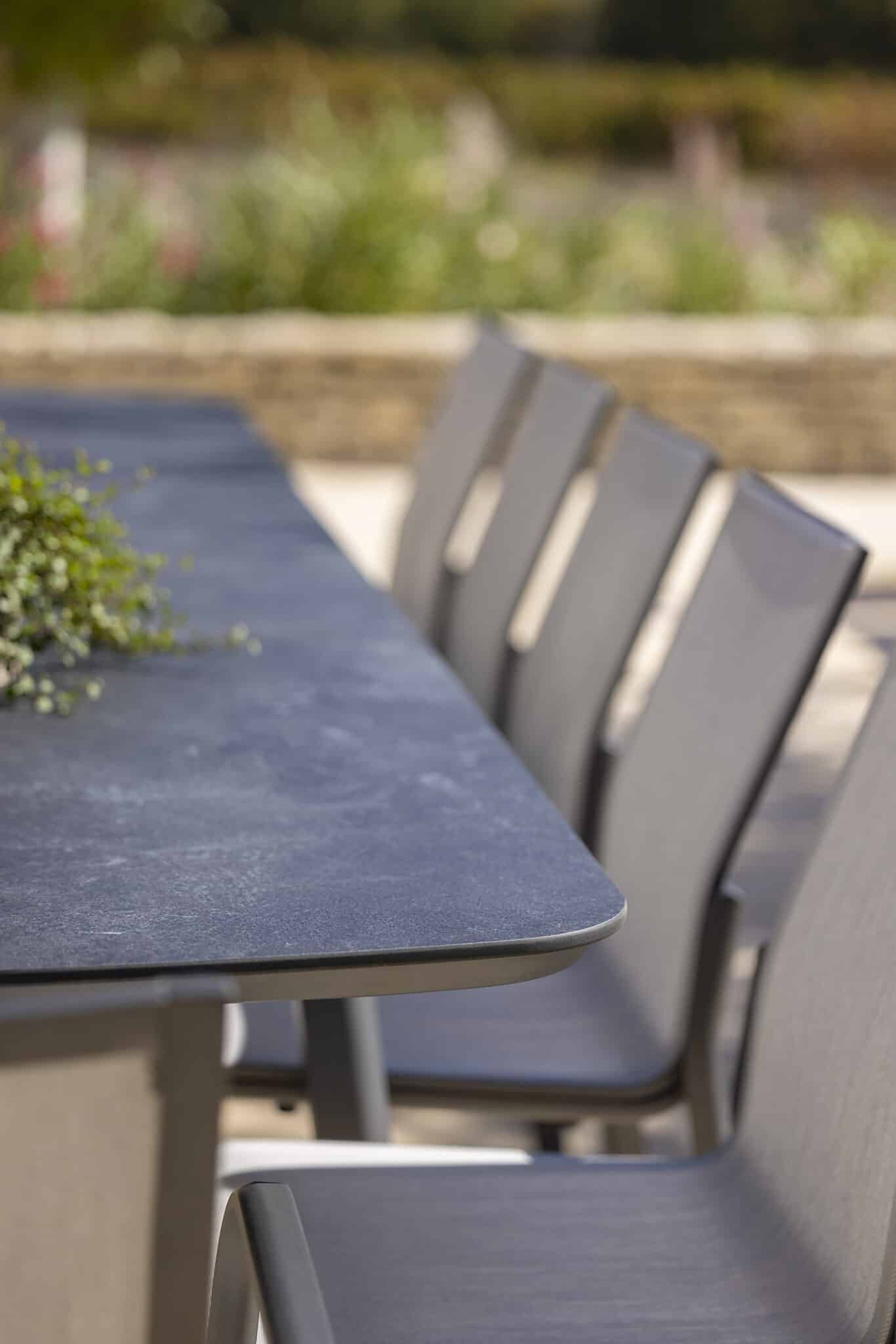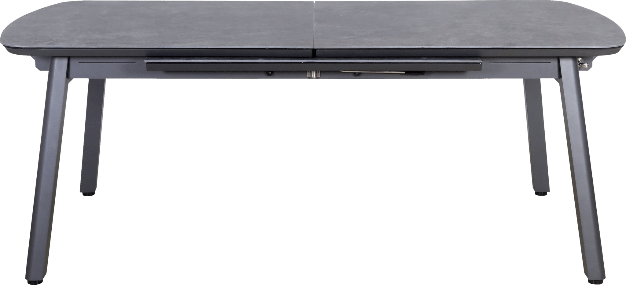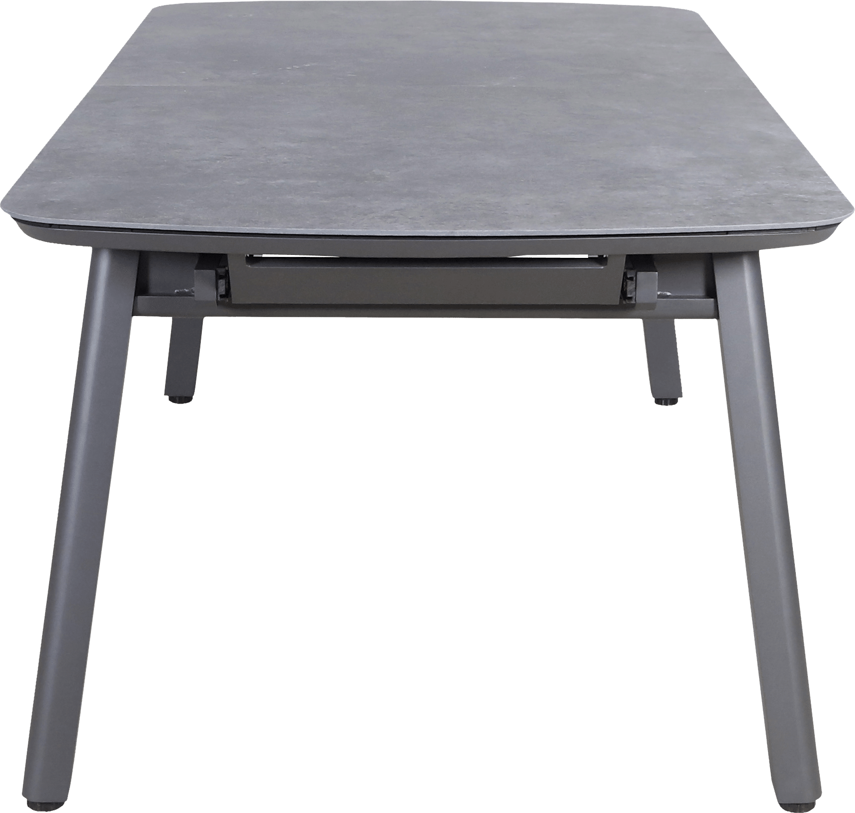 table extensible COPENHAGUE aluminium gris espace HPL ardoise conçue pour aménager un espace extérieur modulable, avec une grande capacité d’accueil et un design contemporain. Son système d’allonge permet d’adapter facilement la table selon le nombre de convives.