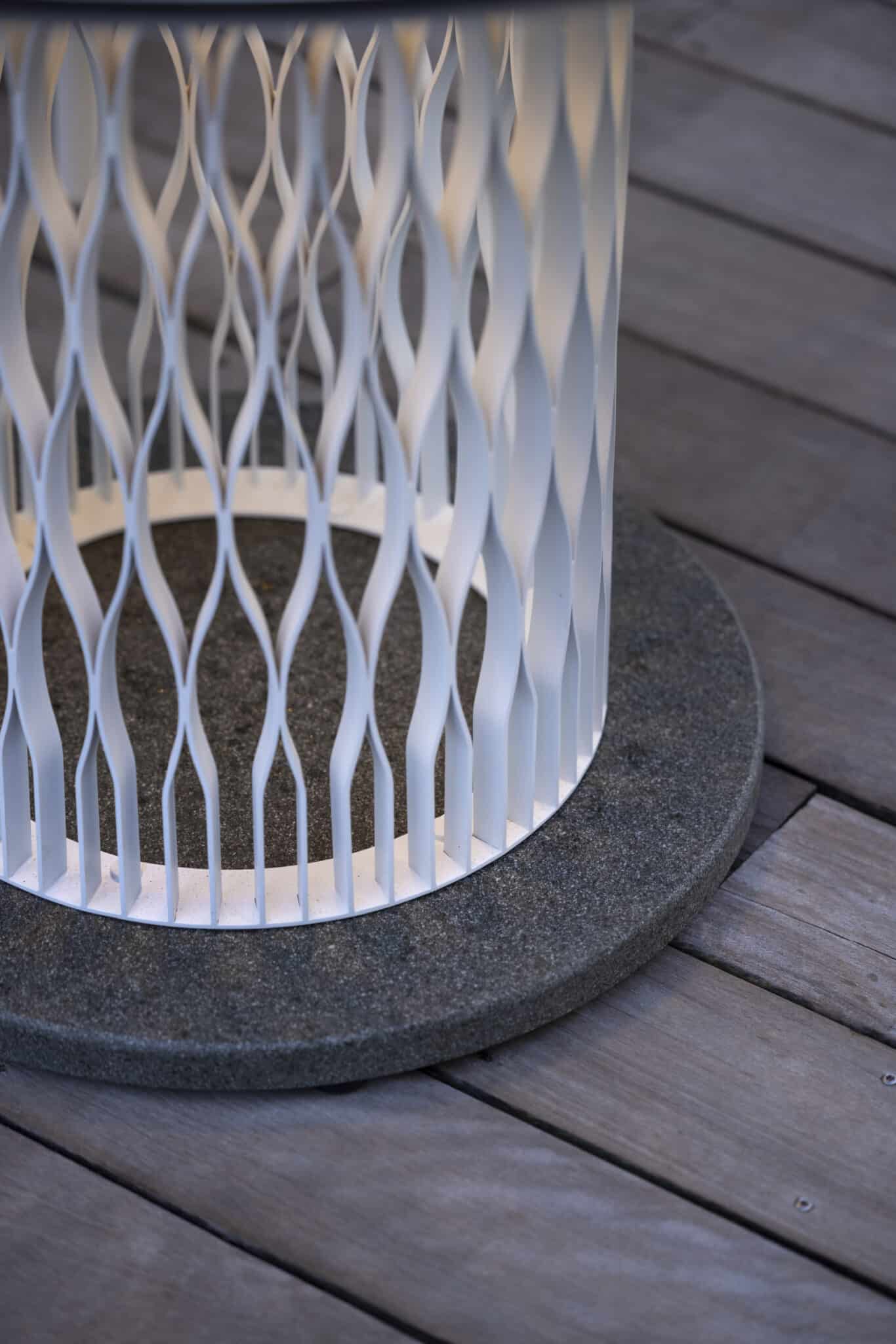 La Table de repas CADIX – Blanc se distingue par son piètement ajouré au design graphique. Son aluminium blanc apporte luminosité et légèreté visuelle, tandis que son plateau en HPL effet béton ciré renforce son style contemporain.