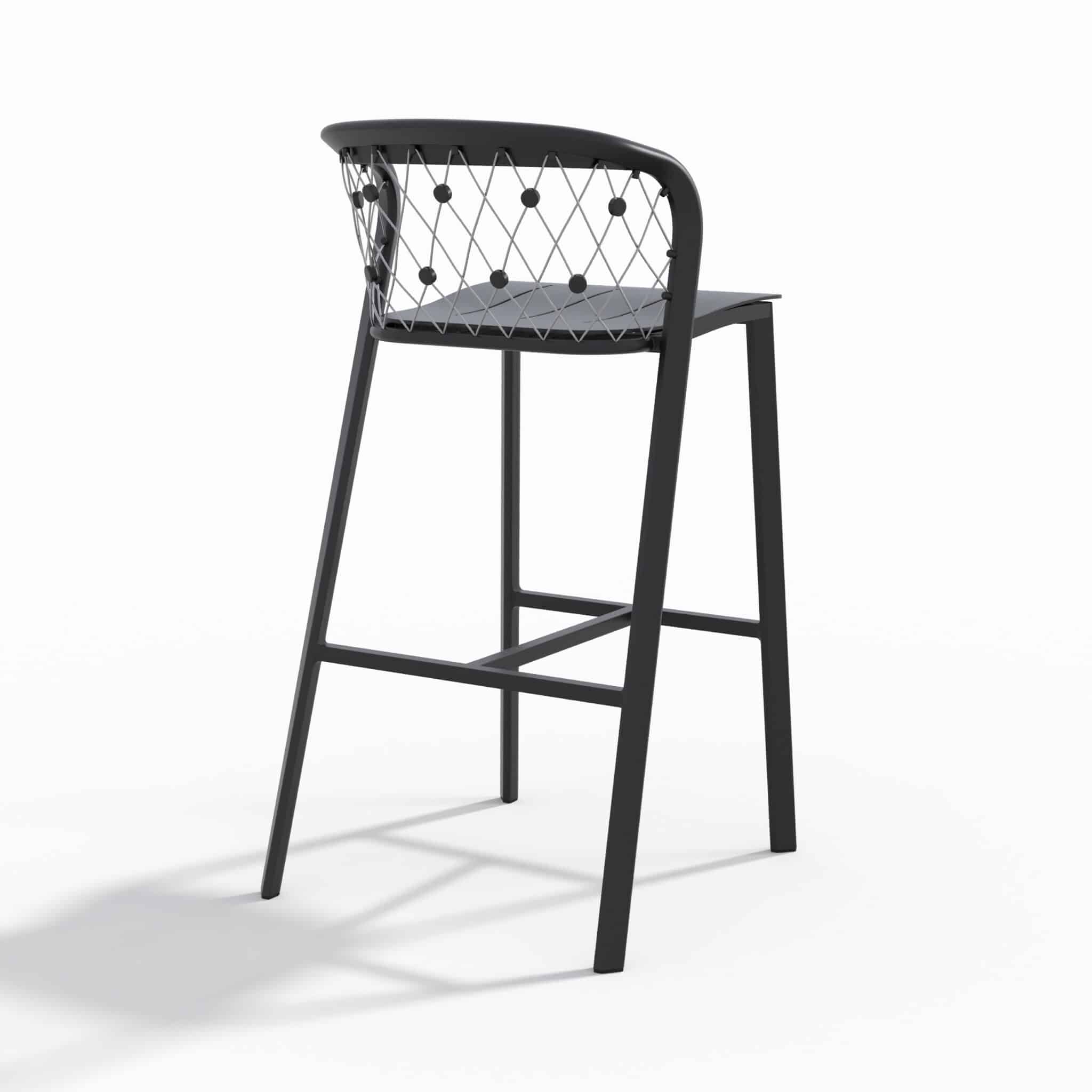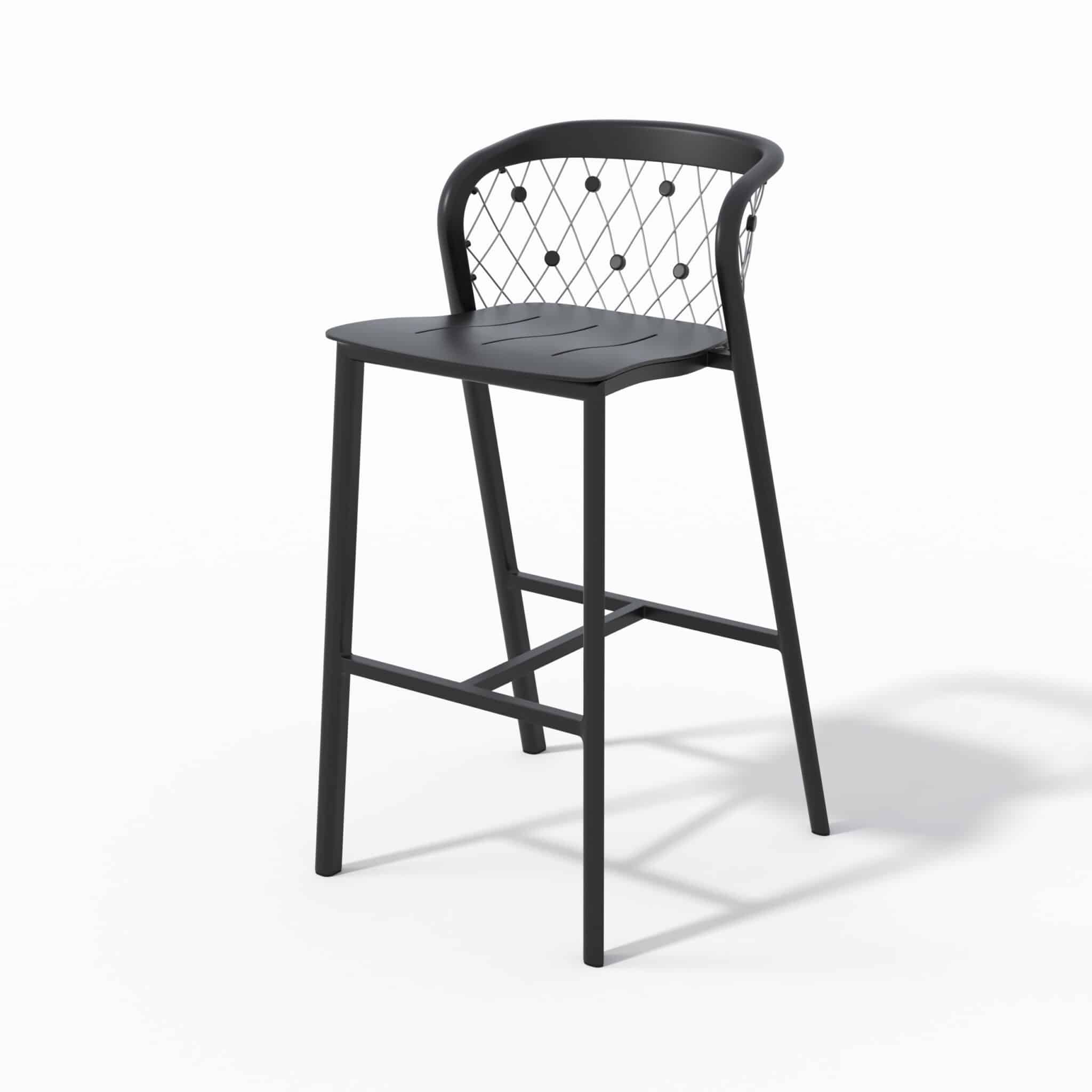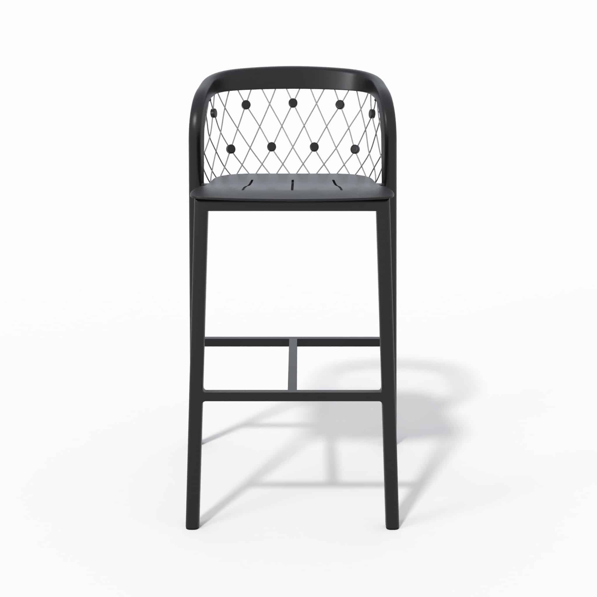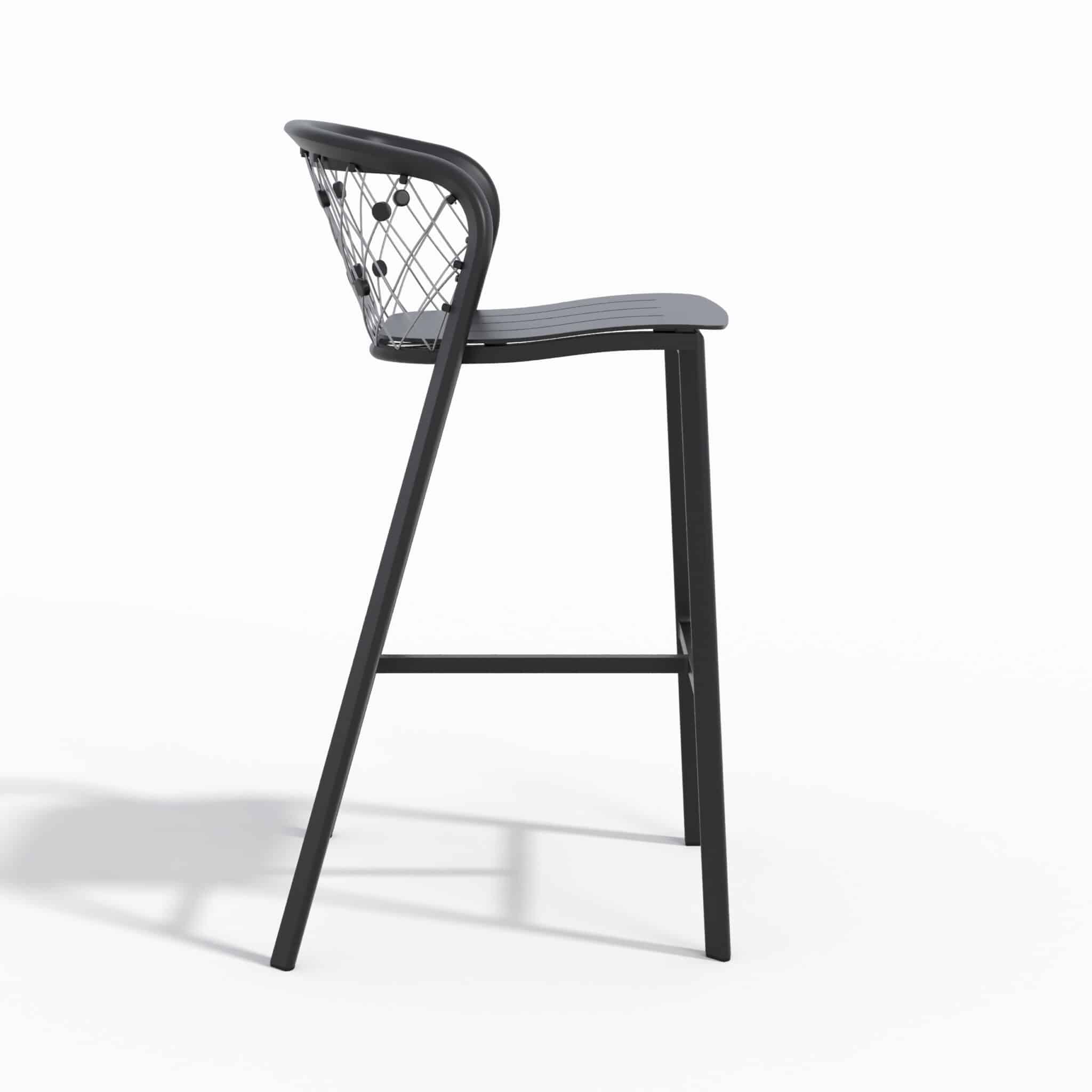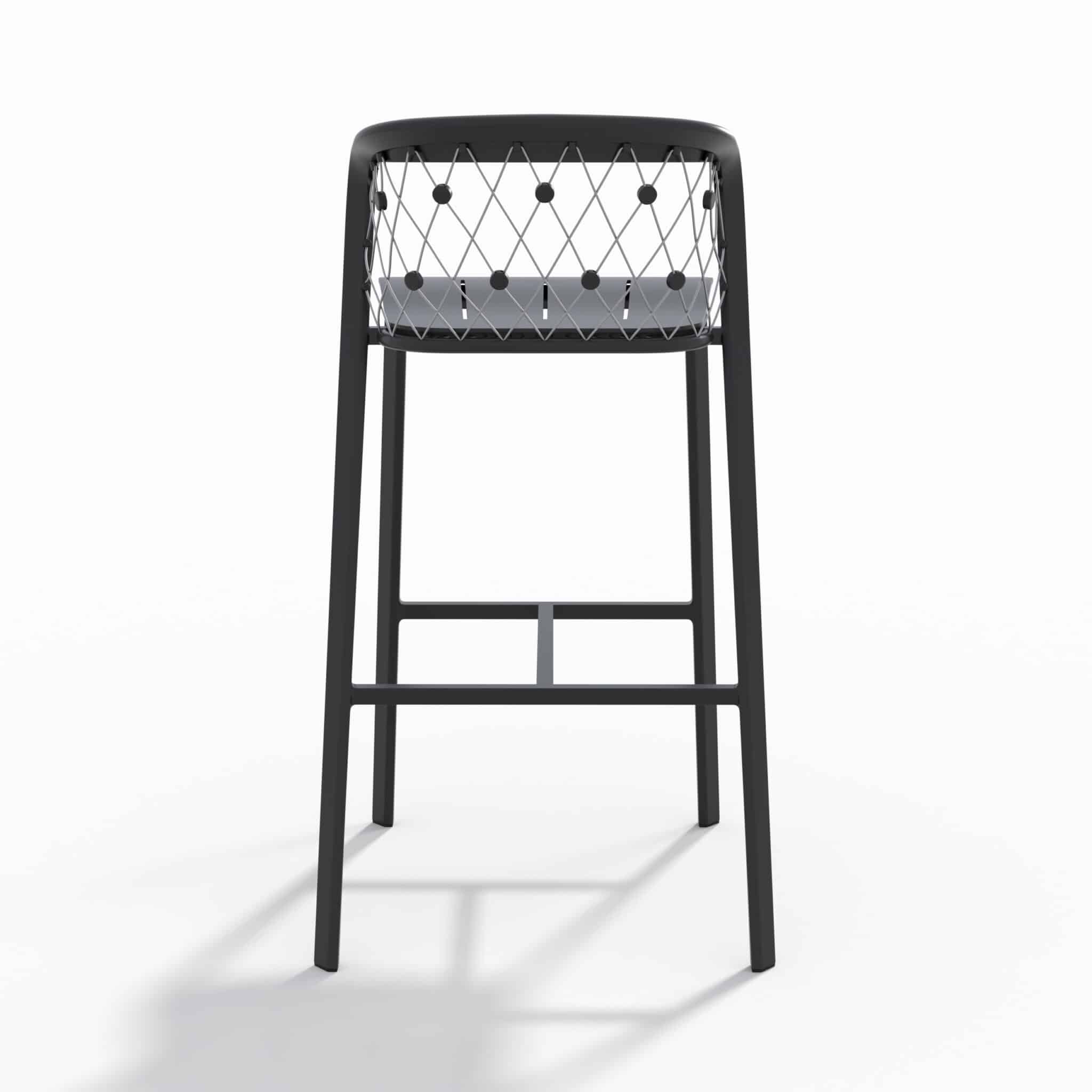 Ce tabouret de bar jardin est fabriqué en aluminium noir avec des câbles en inox 316, garantissant une excellente résistance face à l’humidité, aux UV et aux variations climatiques. Il est parfaitement adapté à un usage extérieur intensif sans risque de corrosion.
