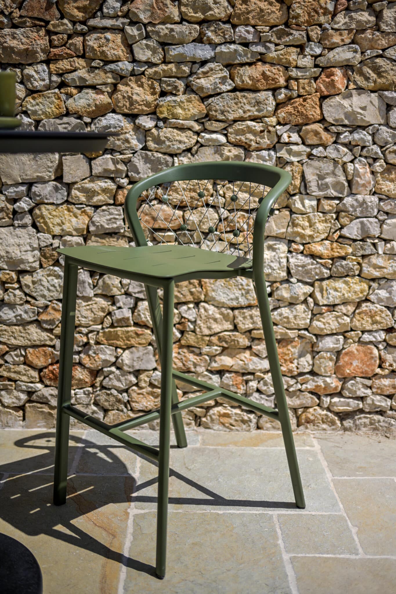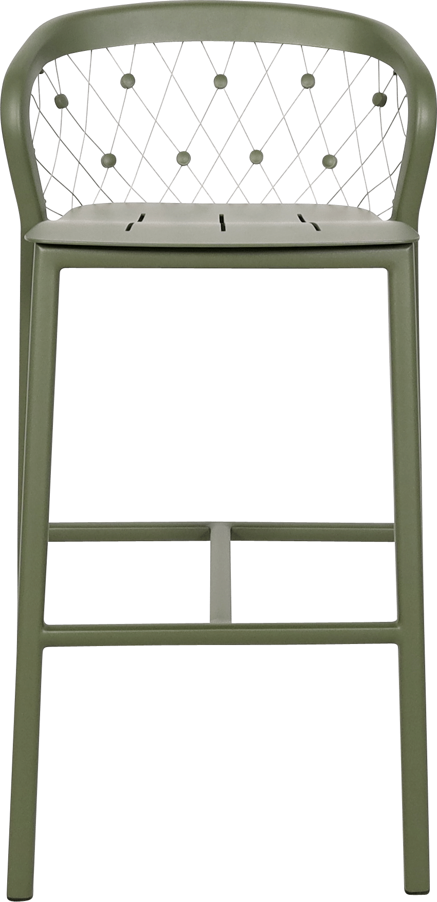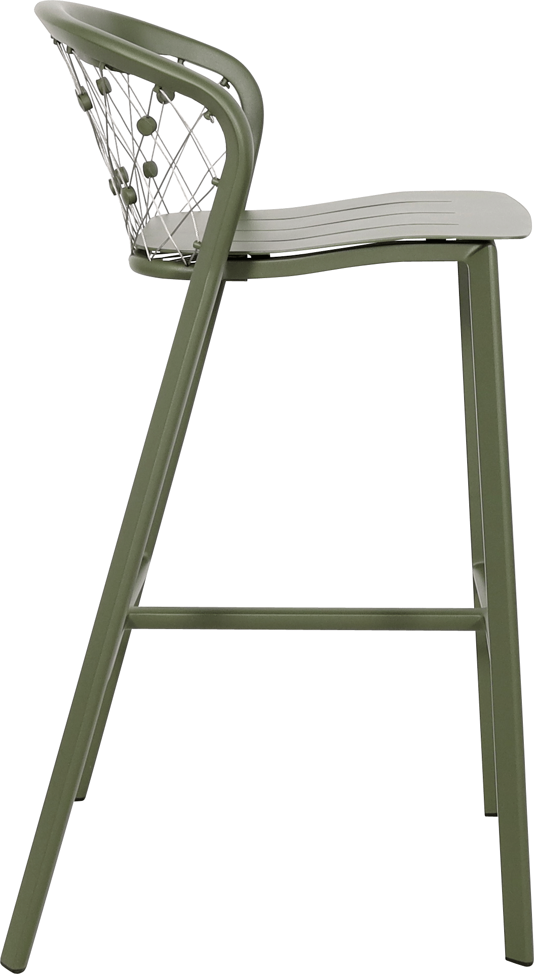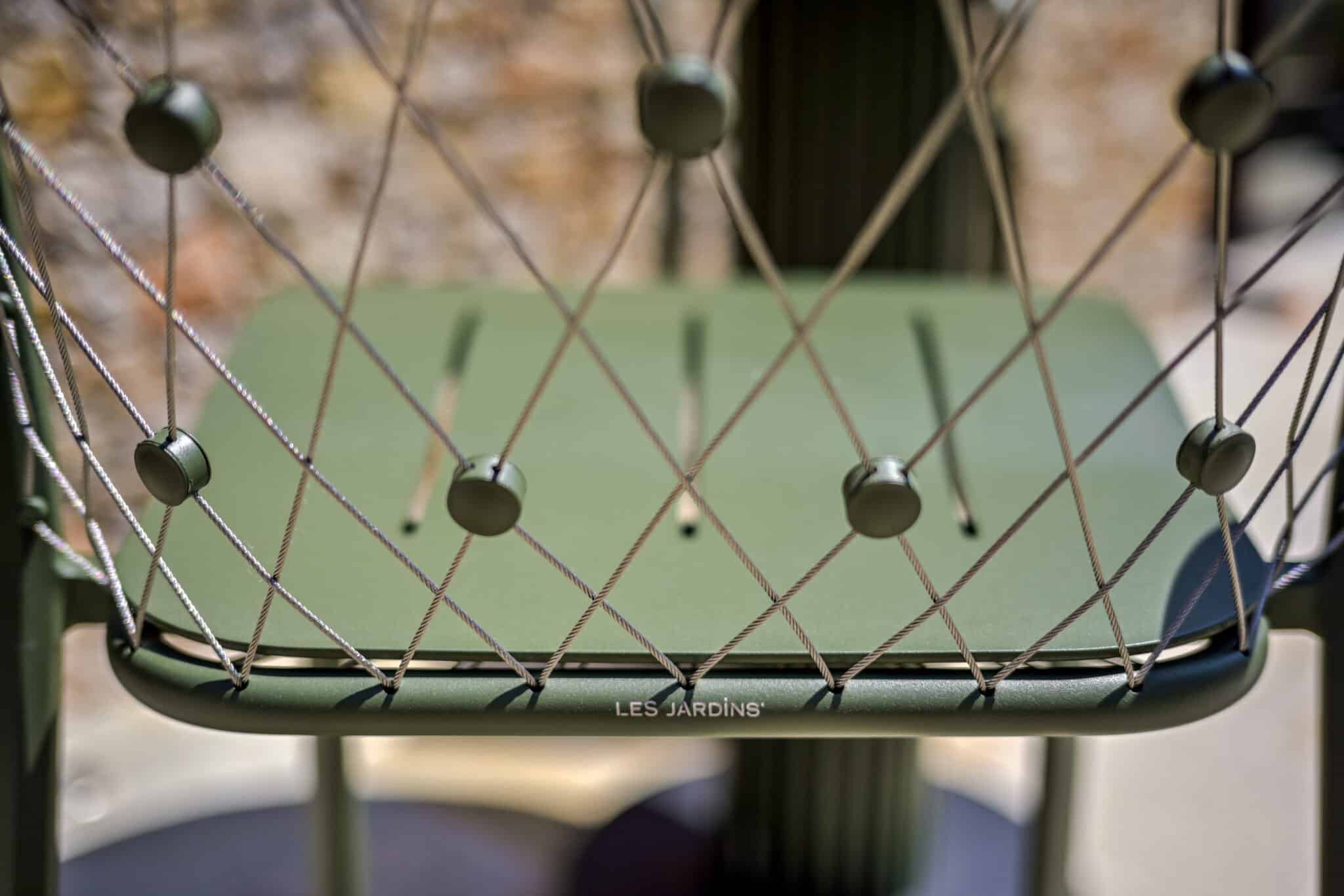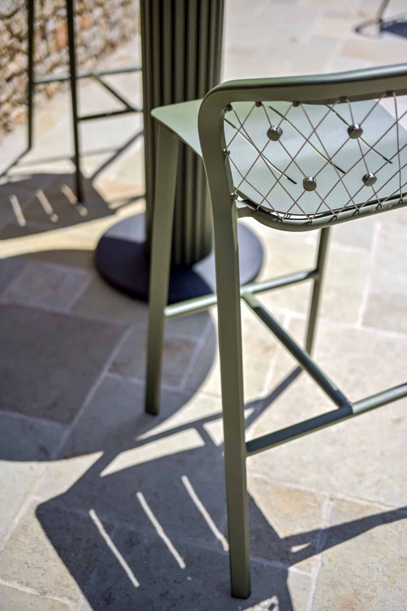 Ce tabouret de bar jardin est fabriqué en aluminium vert avocat avec des câbles en inox 316, garantissant une excellente résistance face à l’humidité, aux UV et aux variations climatiques. Il est parfaitement adapté à un usage extérieur intensif sans risque de corrosion.